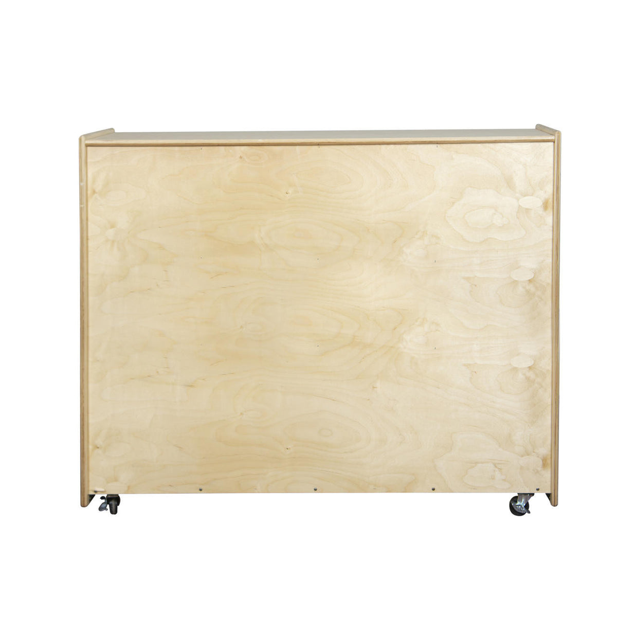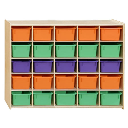 GREENGUARD Gold certified. (25) assorted pastel trays will store all of your small manipulatives, toys, and supplies to keep them from getting misplaced. Constructed from Birch Plywood, and coated with our exclusive Tuff-Gloss™ UV finish. A recessed back for added strength, stability, and beauty. Fully rounded corners and edges for maximum safety. 38"H x 48"W x 15"D. Fully assembled on locking casters. Lifetime warranty. Made in the U.S.A.
