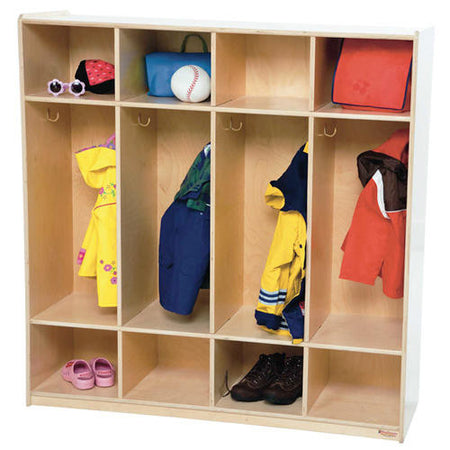 GREENGUARD Gold certified. (4) sections with double coat hooks, plus storage above & below for all your coats, gloves, boots, and more. Constructed from Birch Plywood, and coated with our exclusive Tuff-Gloss™ UV finish. A recessed back for added strength, stability, and beauty. Fully rounded corners and edges for maximum safety. 49"H x 48"W x 15"D. Fully assembled. Lifetime warranty. Made in the U.S.A.