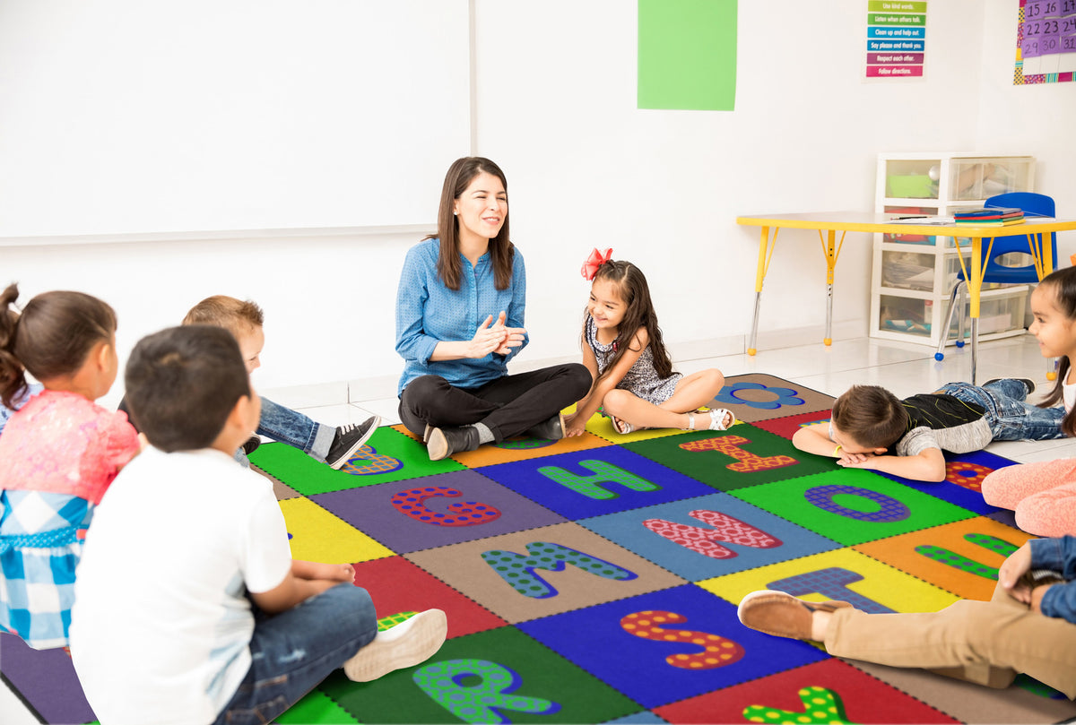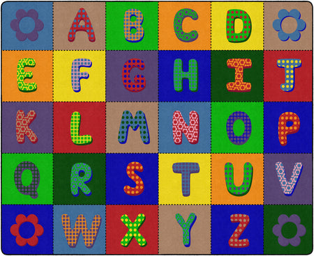 Bold, vivid primary colors and fun patterns will bring excitement to any daycare, playroom, preschool, or classroom. This educational rug features the letters of the alphabet with a quilted pattern for a cozy feel. This carpet is the perfect tool for teaching children of all ages the ABCs.