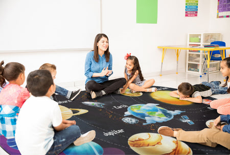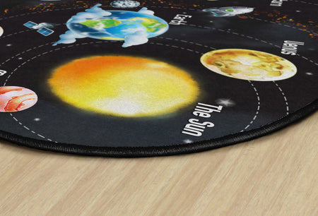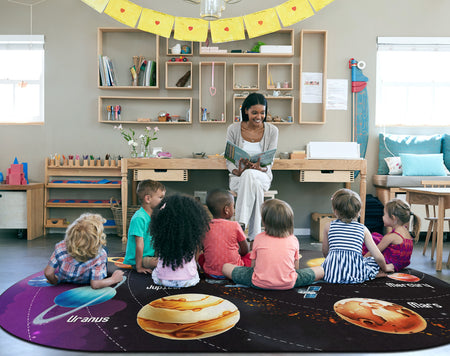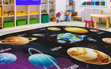 Traveling the Solar System can be so much fun with this vivid classroom rug. Kids learn their planets and their place in the colar system all while they feel like they are walking on outer space. Amazing color and sharpness never seen on a rug before displays photo-realistic illustration to the comfor of carpet. Fly your classroom to outer space!