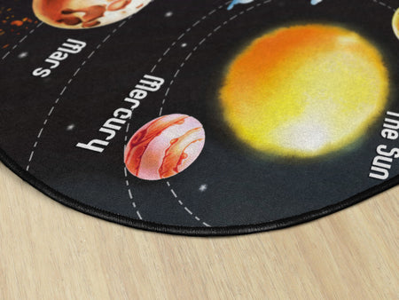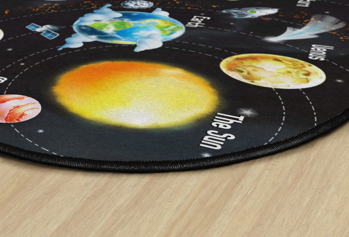 Traveling the Solar System can be so much fun with this vivid classroom rug. Kids learn their planets and their place in the colar system all while they feel like they are walking on outer space. Amazing color and sharpness never seen on a rug before displays photo-realistic illustration to the comfor of carpet. Fly your classroom to outer space!