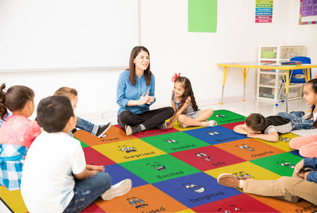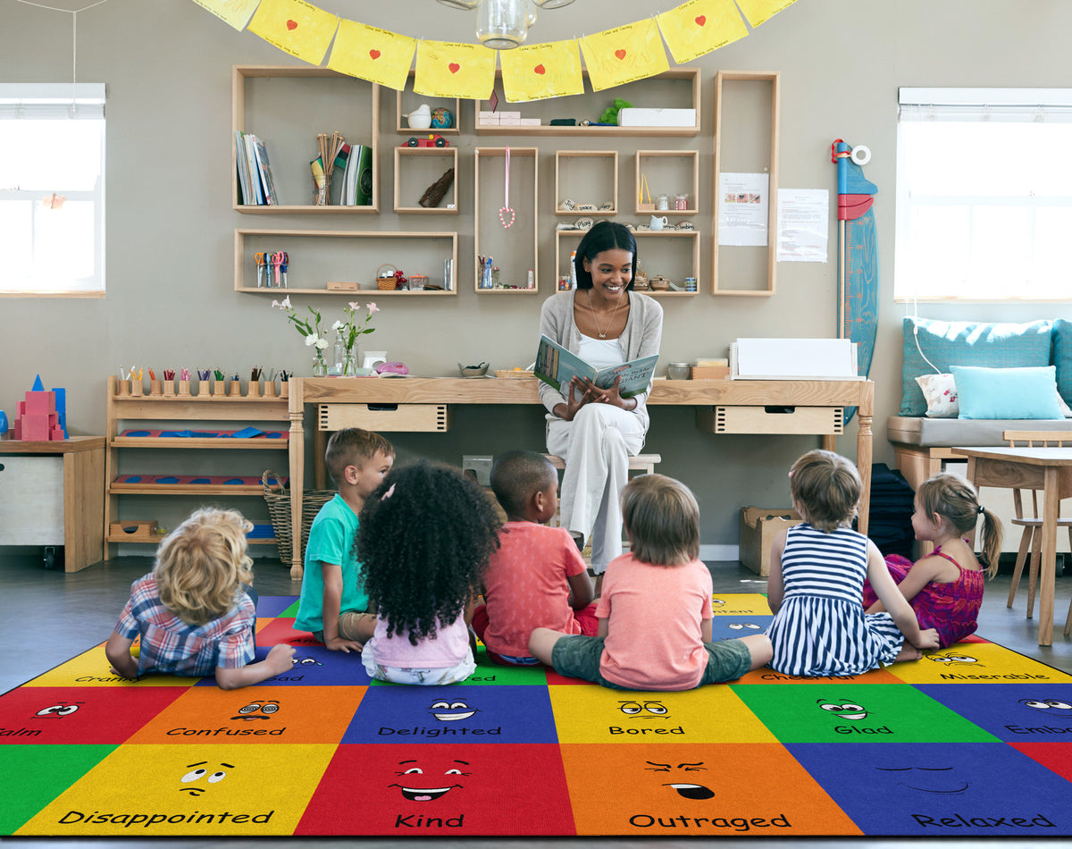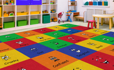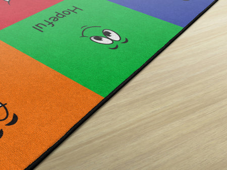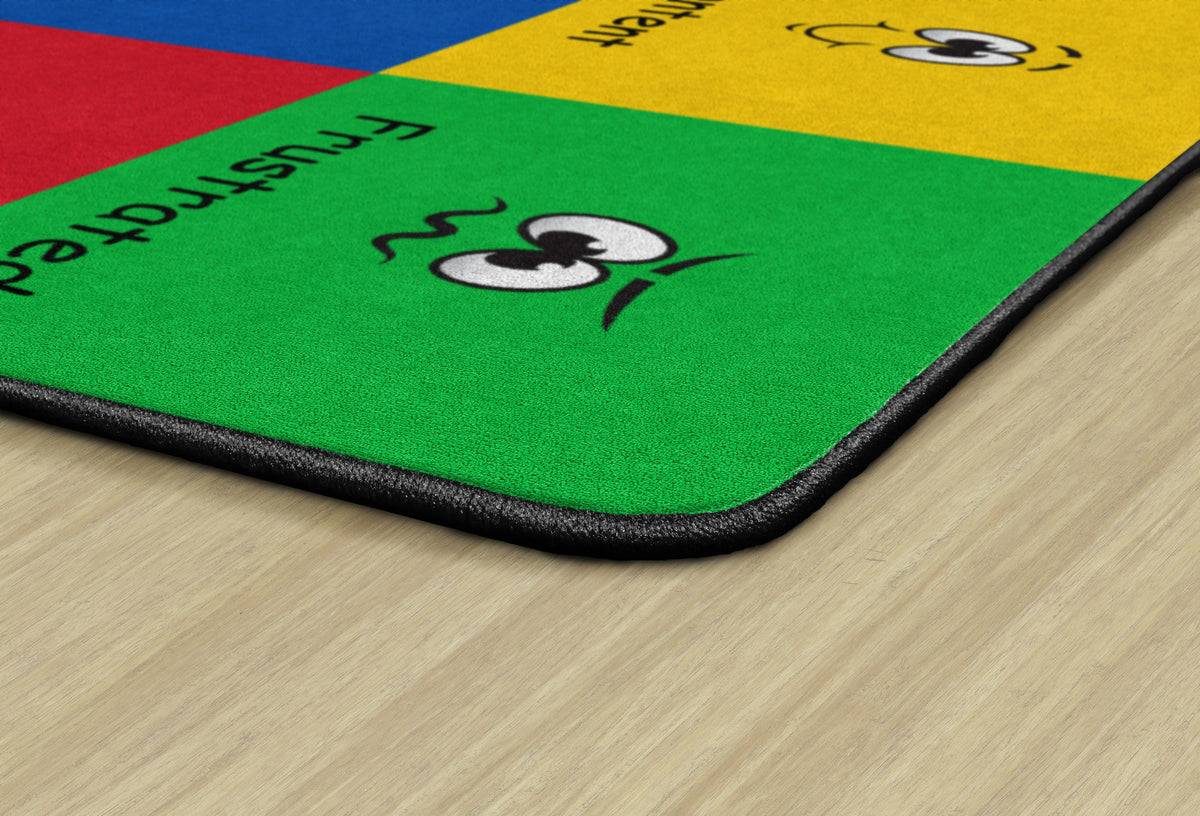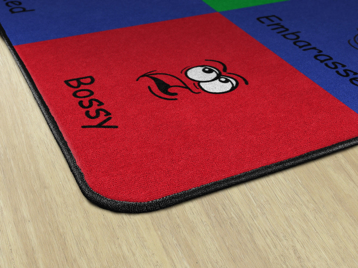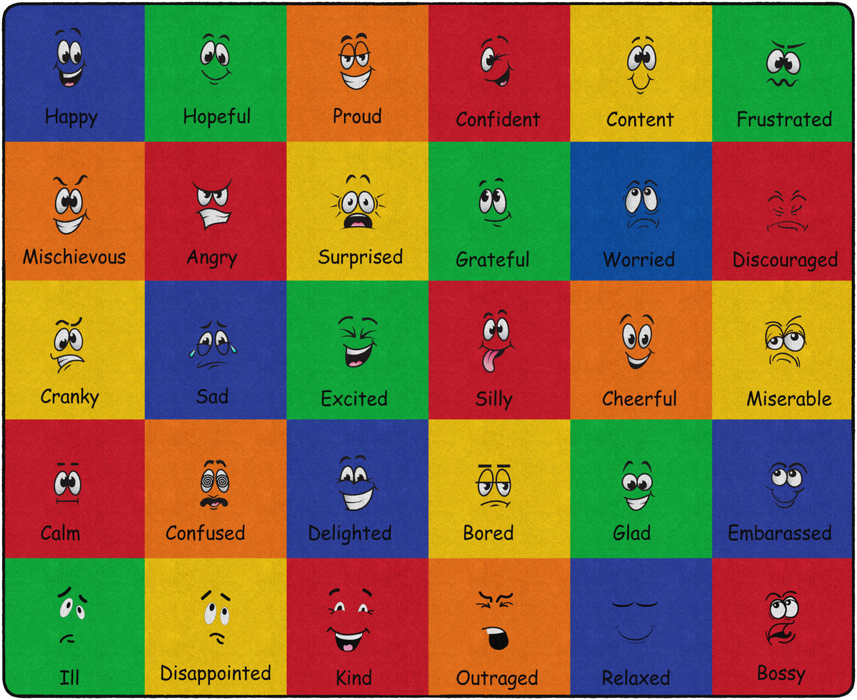 How do you feel? Use your words. This classroom seating rug is all about feelings and the words that describe them. Each classroom seating space depicts a facial expression and gives the corresponding word to that feeling. Teacher can help a student find the word to describe the feeling they are working through. Brigh, cheerful colors brighten any classroom decor.