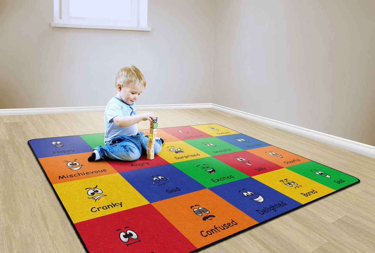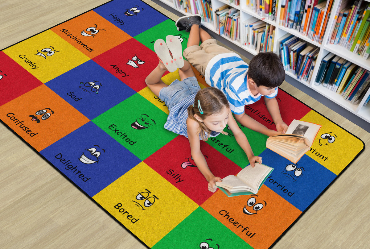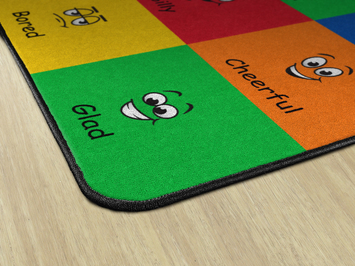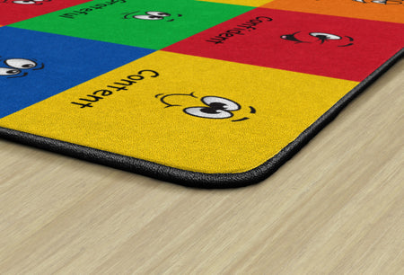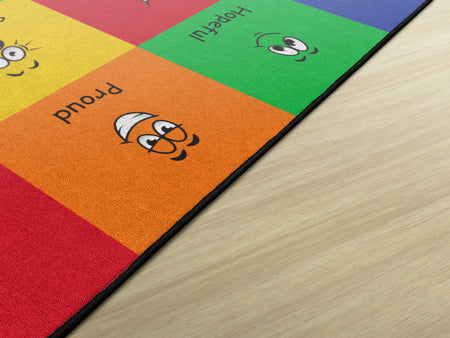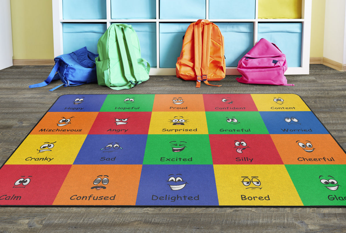 How do you feel? Use your words. This classroom seating rug is all about feelings and the words that describe them. Each classroom seating space depicts a facial expression and gives the corresponding word to that feeling. Teacher can help a student find the word to describe the feeling they are working through. Brigh, cheerful colors brighten any classroom decor.