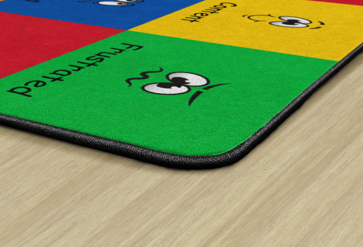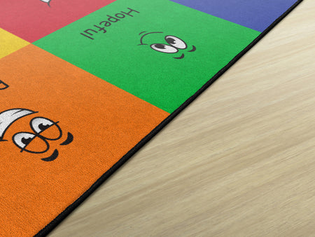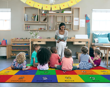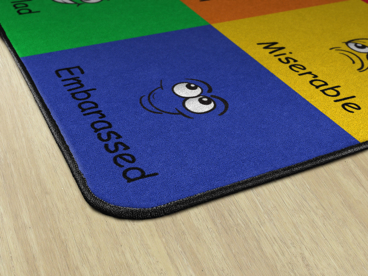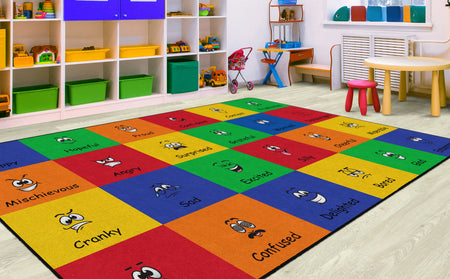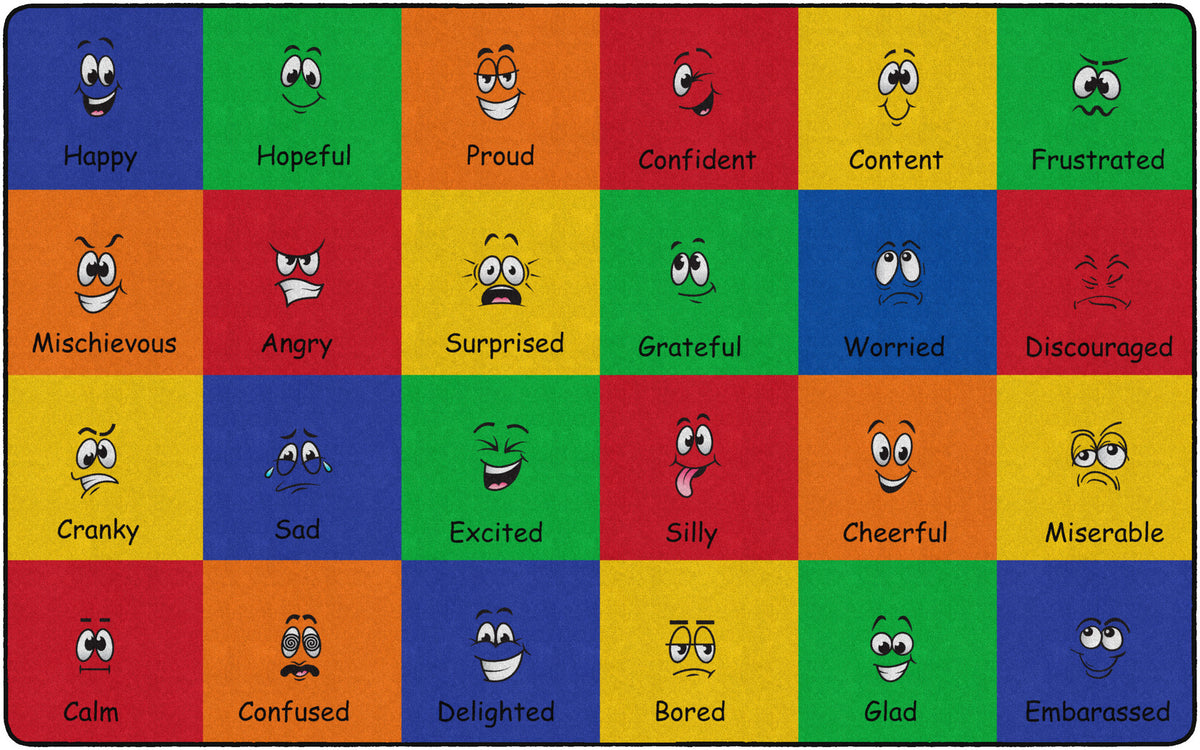 How do you feel? Use your words. This classroom seating rug is all about feelings and the words that describe them. Each classroom seating space depicts a facial expression and gives the corresponding word to that feeling. Teacher can help a student find the word to describe the feeling they are working through. Brigh, cheerful colors brighten any classroom decor.