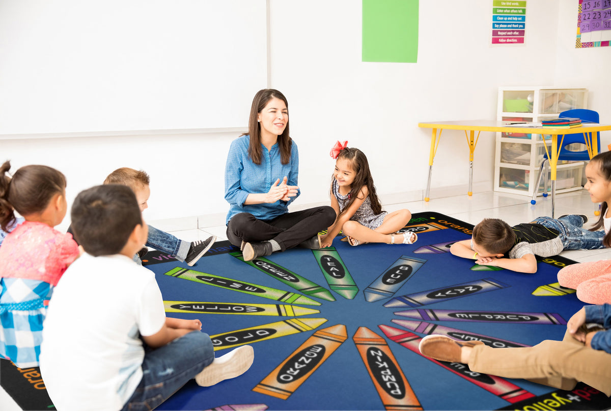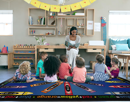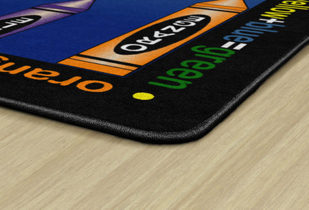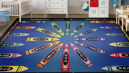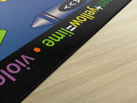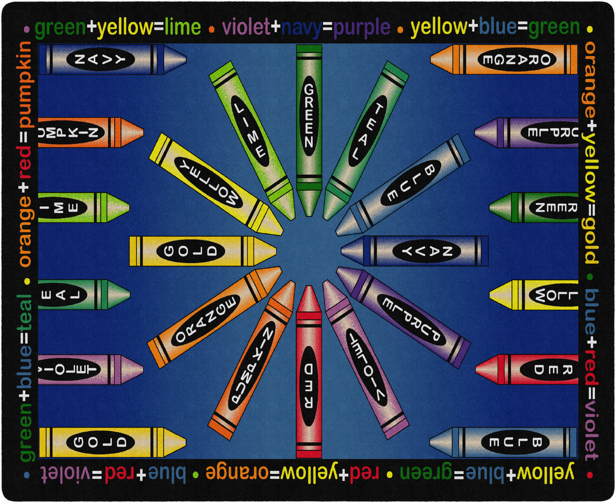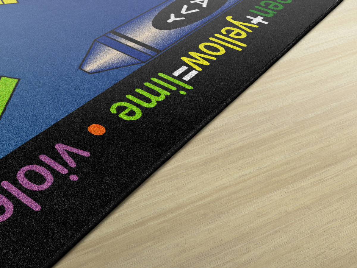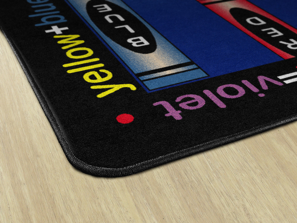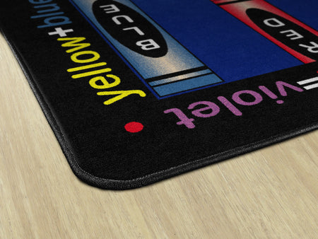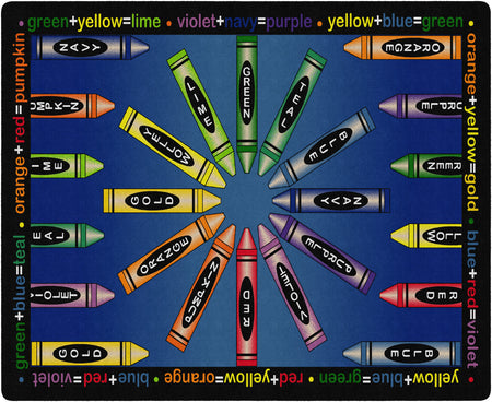 Gold, violet, pumpkin, and lime! This carpet is sure to ignite an artistic time. This detailed color wheel is a helpful visual on mixing hues while providing a colorful spot for budding Picasso's to explore color schemes.