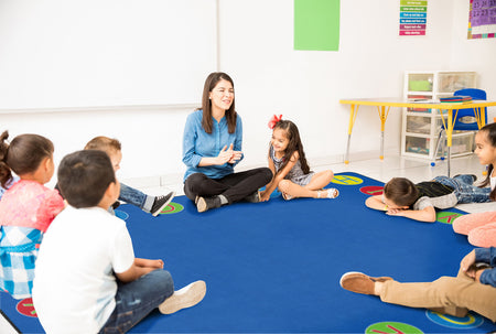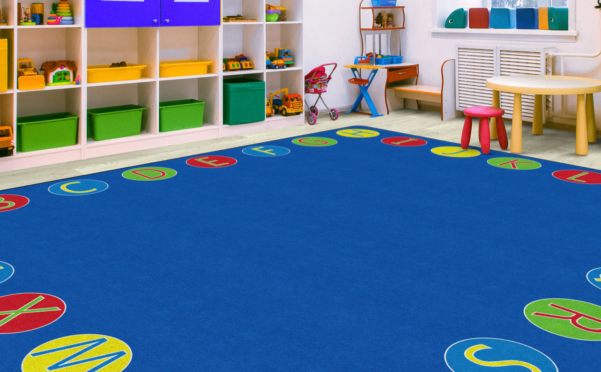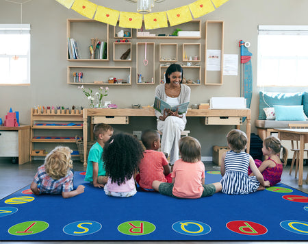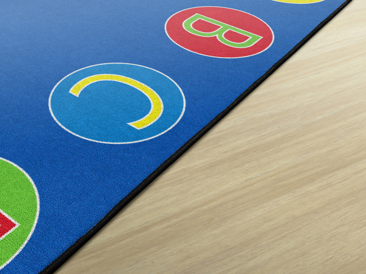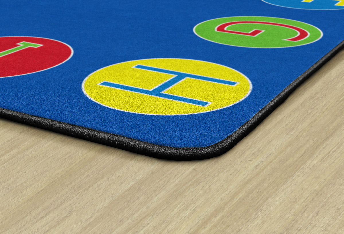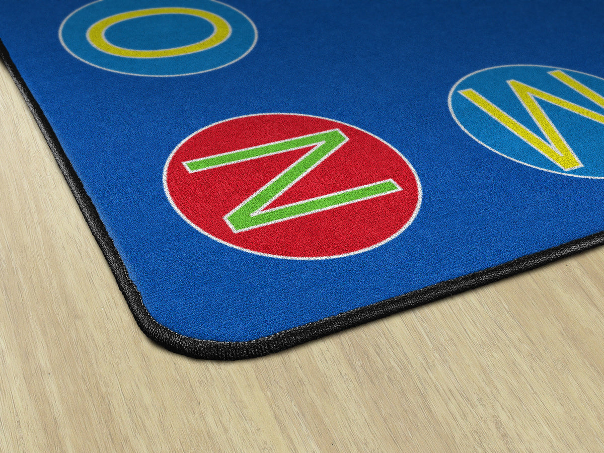 Simple colored circles with every letter of the alphabet provide organized seating to your classroom. This learning rug has a seating spot for up to 26 students. Use it with the Alphabet Seating Squares. Treated with STAINLESS stain guard for superior soil resistance and FORCE 5, a permanent anti-microbial agent to guard against odor, mildew and mold. All Flagship Carpets are CRI Green Label Plus Certified and made 100% in the USA.