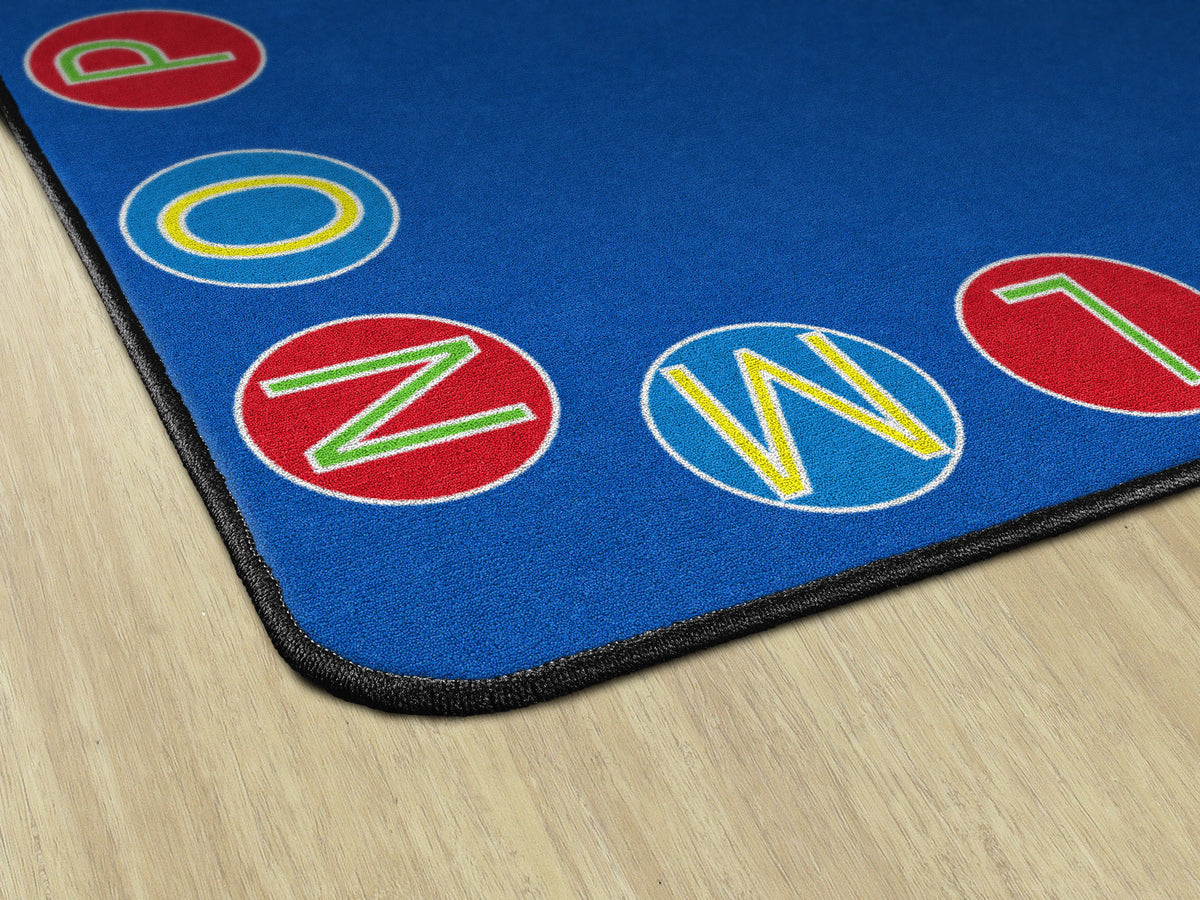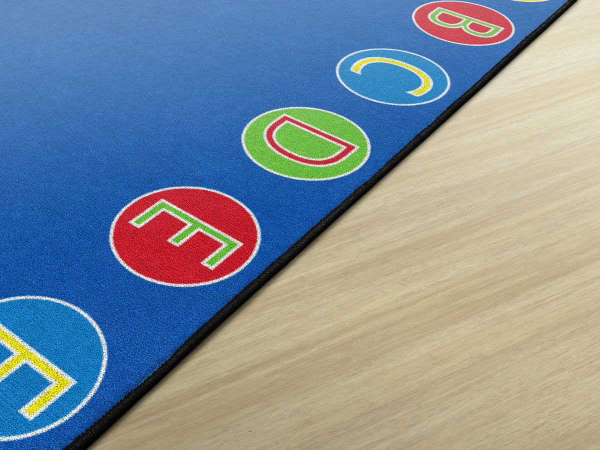 Simple colored circles with every letter of the alphabet provide organized seating to your classroom. This learning rug has a seating spot for up to 26 students. Use it with the Alphabet Seating Squares. Treated with STAINLESS stain guard for superior soil resistance and FORCE 5, a permanent anti-microbial agent to guard against odor, mildew and mold. All Flagship Carpets are CRI Green Label Plus Certified and made 100% in the USA.