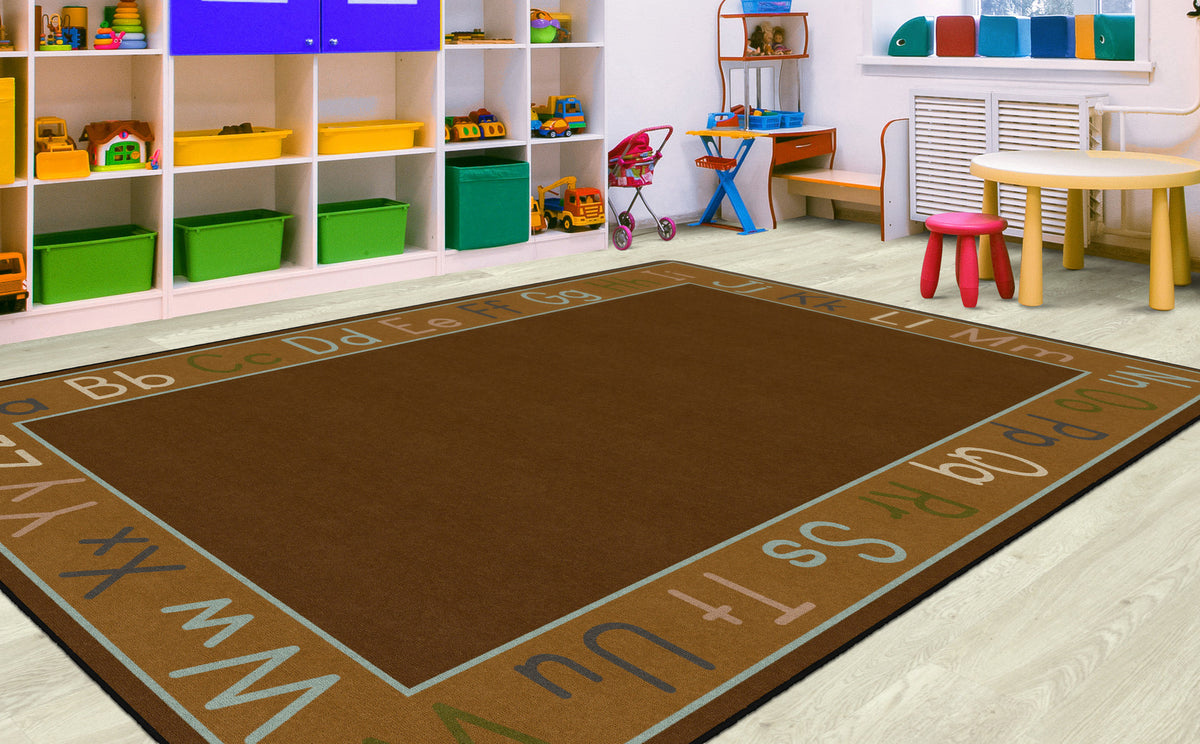 Create a tranquil environment with warm shades of earth tone browns and greens. Featuring all letters of the alphabet in upper and lower case, this area rug is the perfect tool for encouraging little learners. Treated with STAINLESS stain guard and FORCE 5, a permanent anti-microbial agent to guard against odor, mildew and mold. All Flagship Carpets are CRI Green Label Plus Certified and made 100% in the USA.