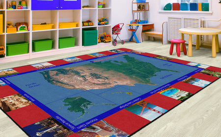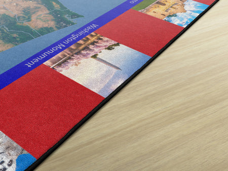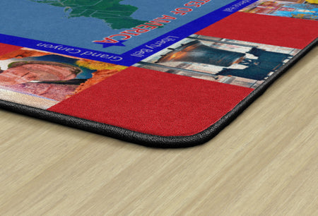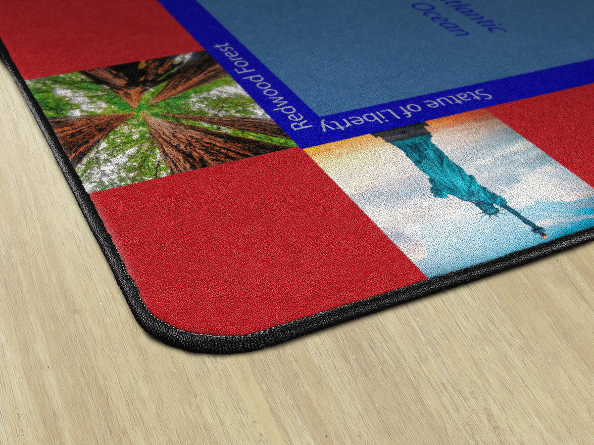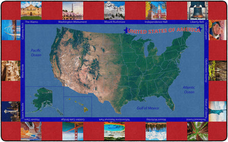 Take your students on a trip around the United States of America with real photography of iconic American landmarks. Children of all ages will enjoy locating and identifying The Grand Canyon, The Alamo, The Golden Gate Bridge, and more! This carpet is treated with STAINLESS stain guard for superior soil resistance, and Force5, a permanent anti-microbial agent to guard against odor, mildew, and mold.