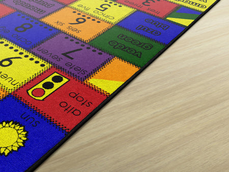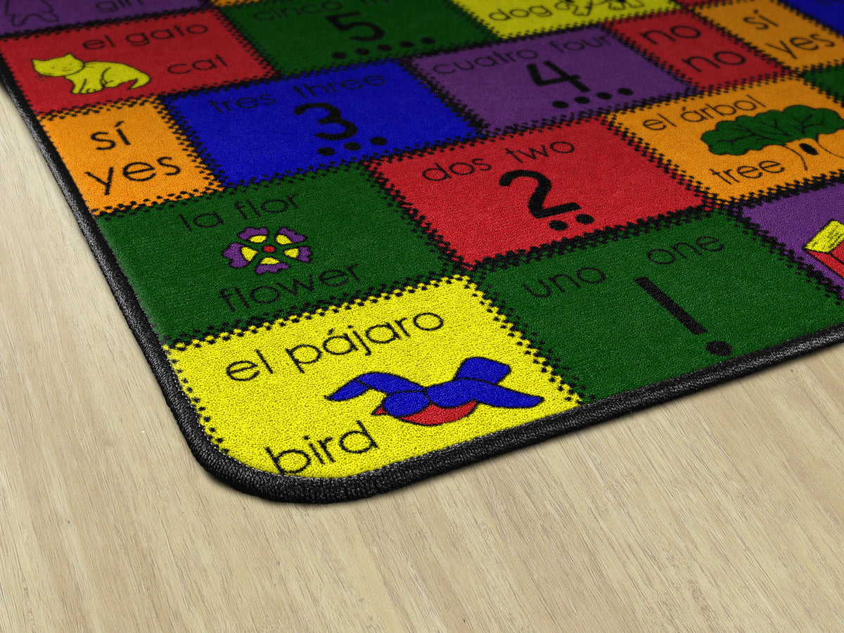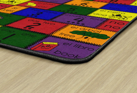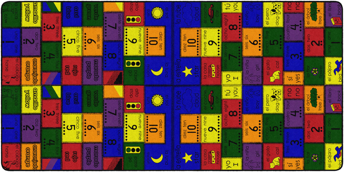 The original bilingual rug! Introduce Spanish to your learning center with this bilingual rug. Each rug has a colorful patchwork of numbers, colors, and pictures with both Spanish and English words. This pattern is not too busy to teach and will not distract. (includes a teaching manual).