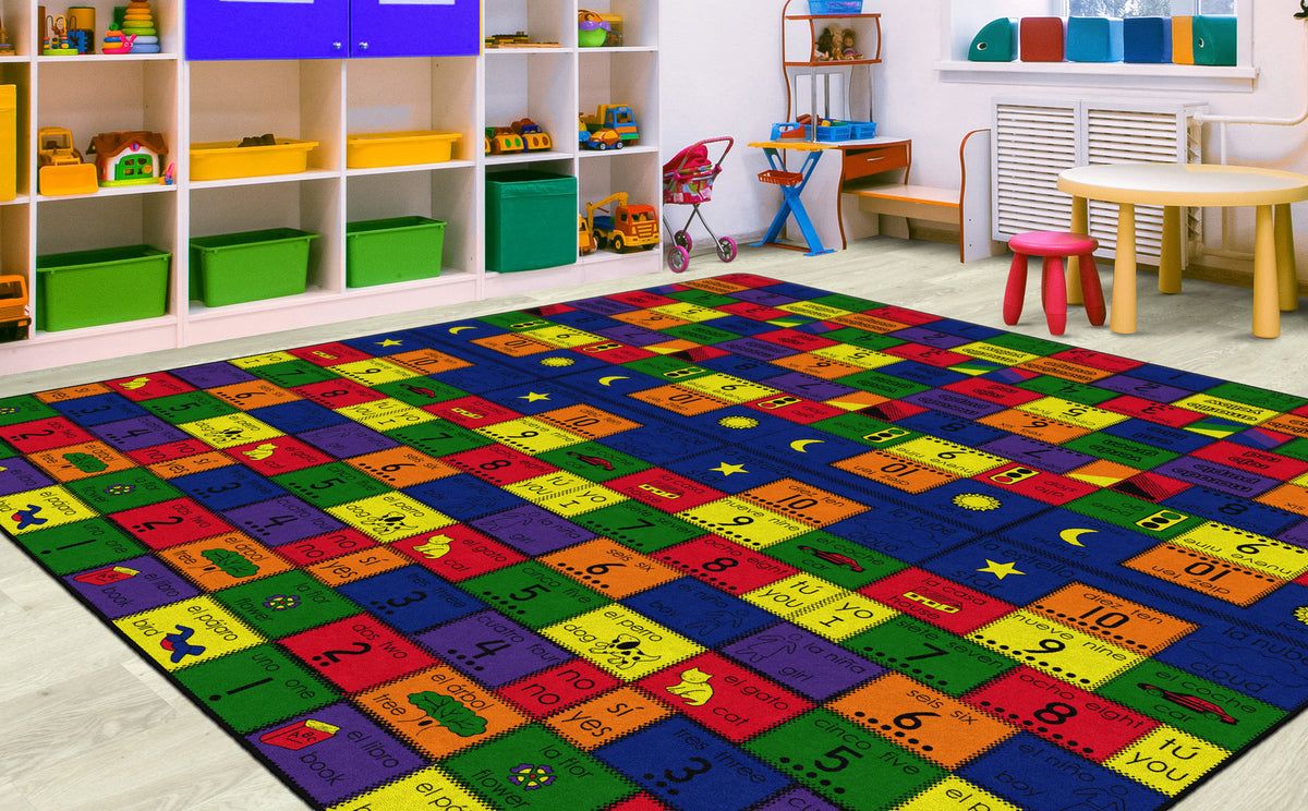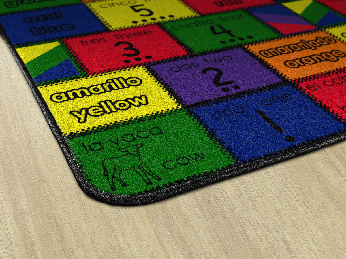 The original bilingual rug! Introduce Spanish to your learning center with this bilingual rug. Each rug has a colorful patchwork of numbers, colors, and pictures with both Spanish and English words. This pattern is not too busy to teach and will not distract. (includes a teaching manual).