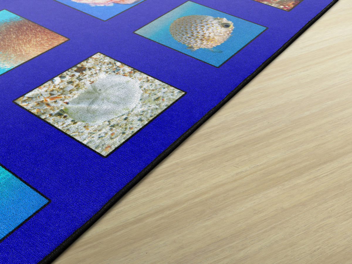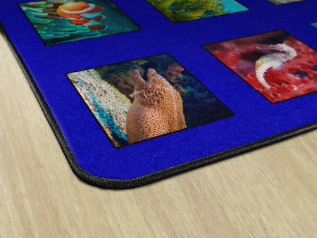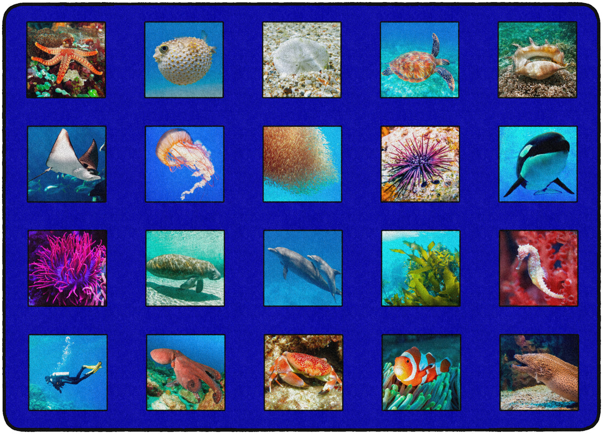 Children of all ages will “dive in” to this fun ocean themed seating rug. Perfect for any daycare, playroom, preschool, or classroom, this educational carpet features real photographs of familiar sea creatures. Students will love identifying dolphins, jellyfish, starfish, crabs, lobsters, and more! In outstanding detail and vivid color, this rug will enhance learning and bring fun and excitement to any space!
