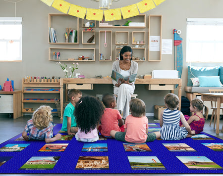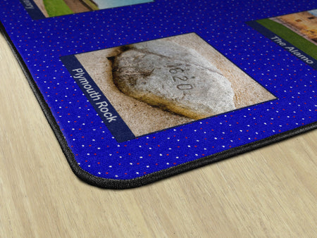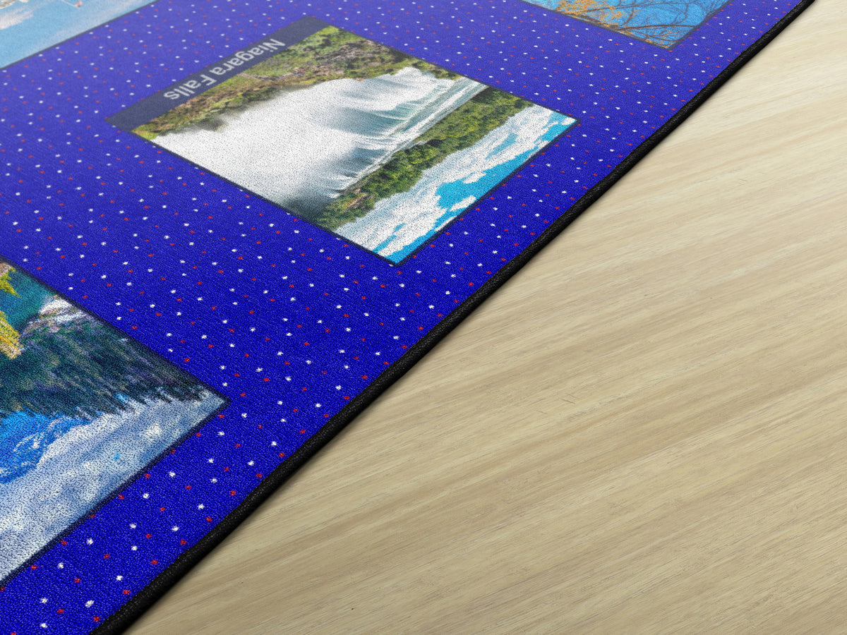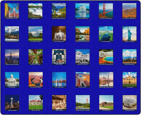 Children of all ages will love exploring the USA with this fun, patriotic seating rug. Perfect for any daycare, playroom, preschool, or classroom, this educational carpet features real photographs of familiar American Landmarks. Students will love identifying The White House, The Grand Canyon, Mount Rushmore, The Statue of Liberty, and more! In outstanding detail and vivid color, this rug will enhance learning and bring fun and excitement to any space!