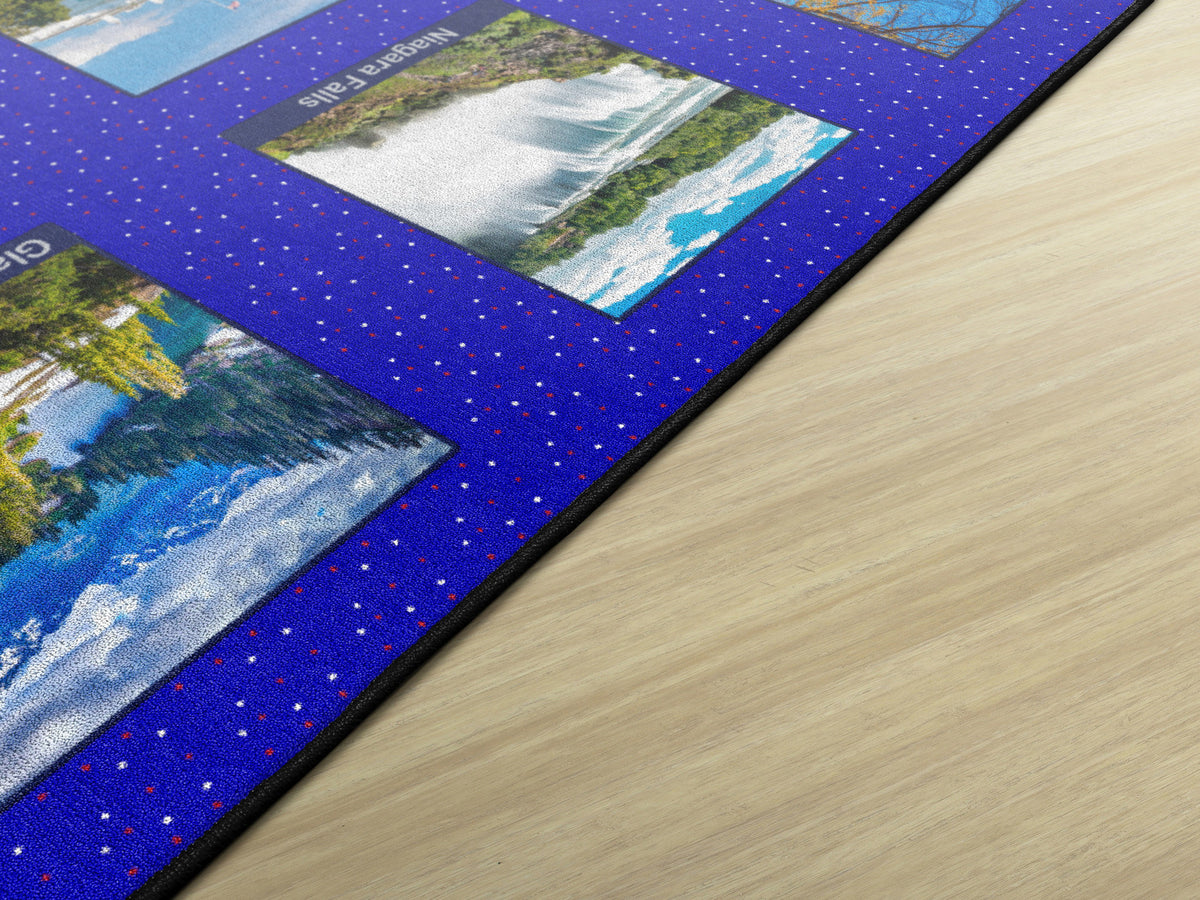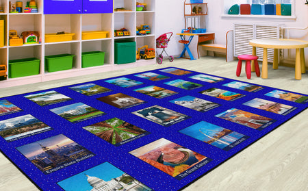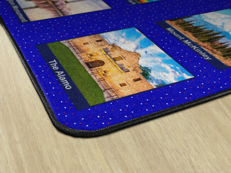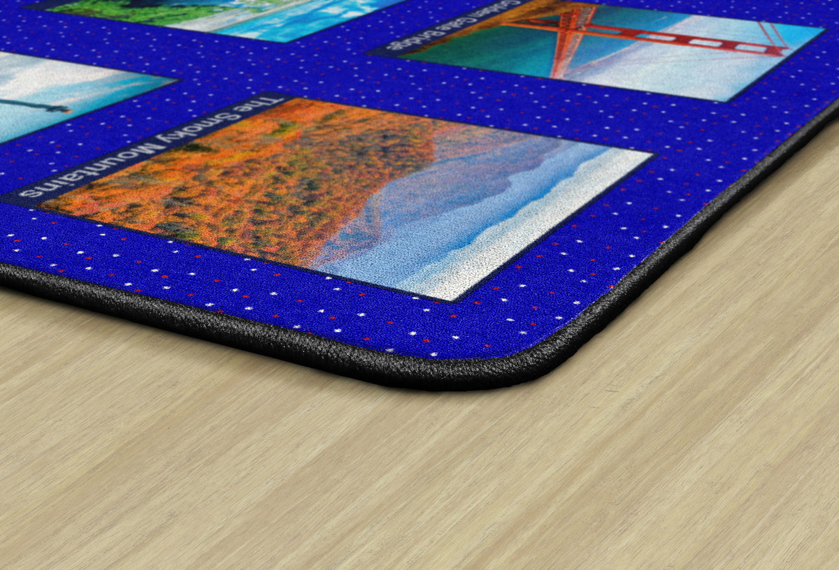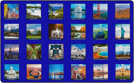 Children of all ages will love exploring the USA with this fun, patriotic seating rug. Perfect for any daycare, playroom, preschool, or classroom, this educational carpet features real photographs of familiar American Landmarks. Students will love identifying The White House, The Grand Canyon, Mount Rushmore, The Statue of Liberty, and more! In outstanding detail and vivid color, this rug will enhance learning and bring fun and excitement to any space!