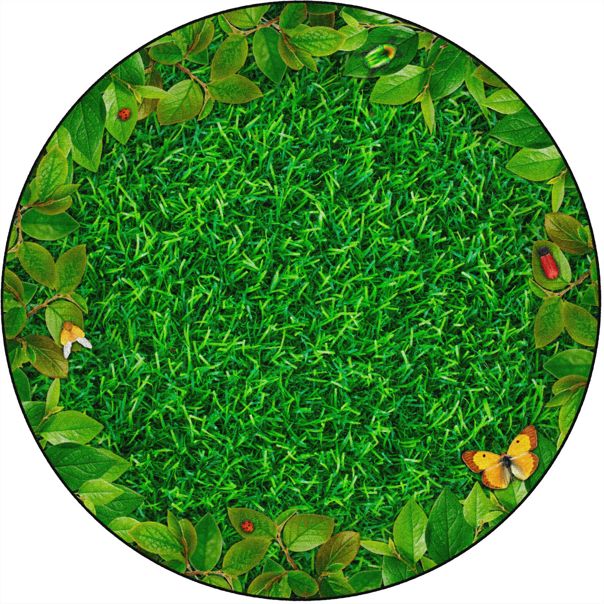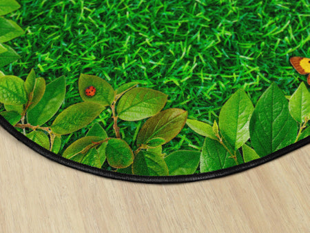 Bring nature indoors with this fun educational rug. Perfect for any daycare, playroom, preschool, or classroom, this carpet features real photographs of grass, leaves, and bugs! In outstanding detail and vivid color, this round area rug will bring fun and excitement to any space.