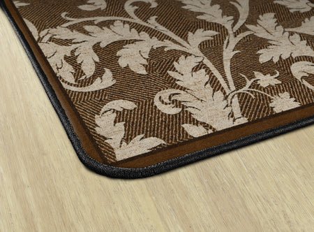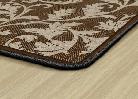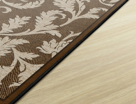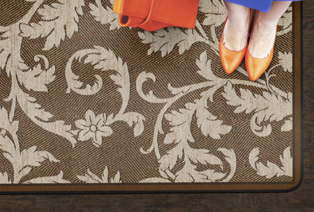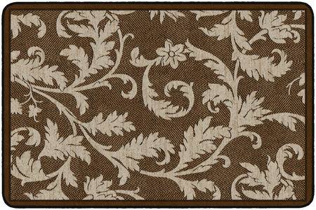 This rug features an elegant floral scroll design in popular brown and beige on a textured background. This beautiful design will add class to any home or office area.