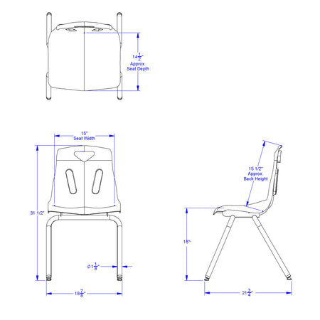 The child-friendly design of this teal Berries Chairs promotes seating comfort, durability, and attractive styling. It has an 18" seat height and can easily be stacked. Chrome-Plated legs provide an upscale look and complement Berries Tables perfectly. The colorful polypropylene shell is easy to clean, prevents blushing, and even eliminates annoying static electricity. Non-exposed rivets on the heavy-gauge steal frame prevent snags and glides reduce noise, prevent scratching, and resist rust. Product Dimension : 19" width X31.5" Height X 22.5" Depth Made in USA, Life Time Warranty