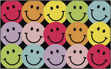 The smiley faces on this rug are sure to bring instant cheer! And the classic rainbow palette with the black background makes this happy and beautiful rug a showstopper!