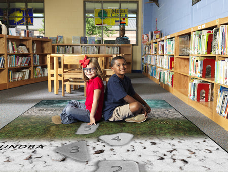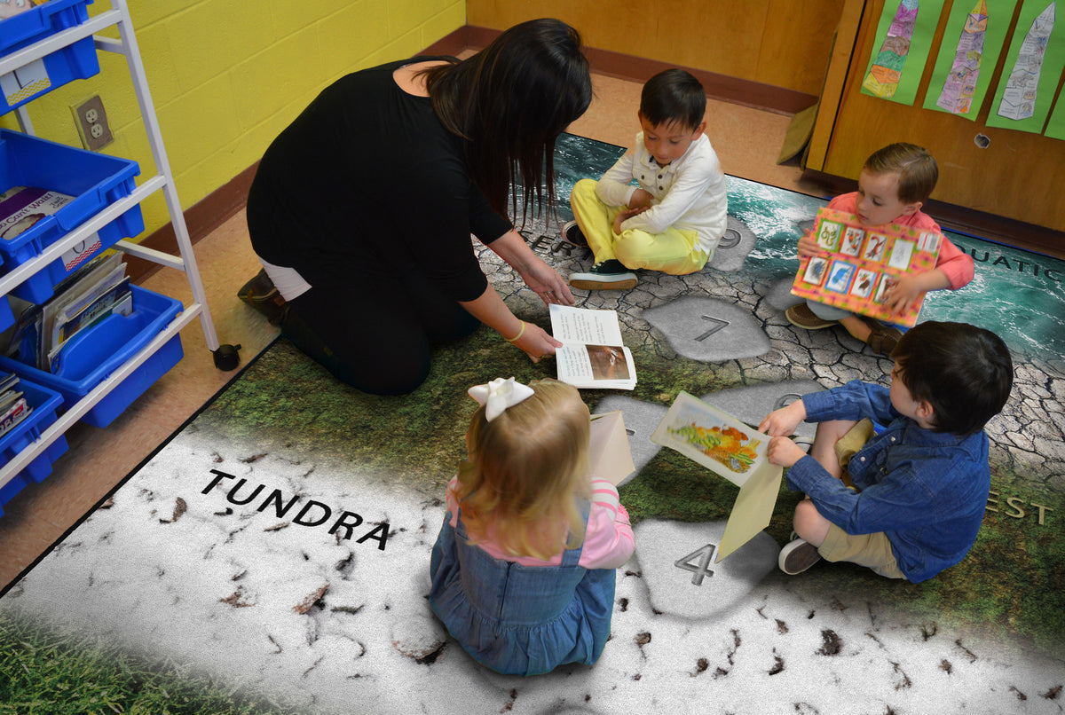 Young children and students will love walking across life-size stepping stones throughout the different biomes. Printed on stain-resistant carpet, this rug features real photography to bring a wow-factor to any classroom, playroom, or daycare.