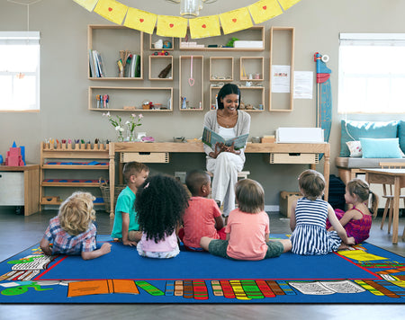Cute little Bookworms experiencing the joy of reading, your early learners will love this solid blue, calming carpet in your reading area. Treated with STAINLESS stain guard for superior soil resistance and FORCE 5, a permanent anti-microbial agent to guard against odor, mildew and mold. All Flagship Carpets are CRI Green Label Plus Certified and made 100% in the USA.