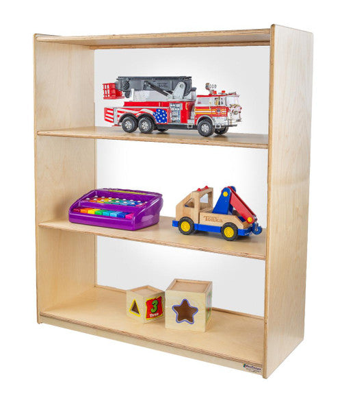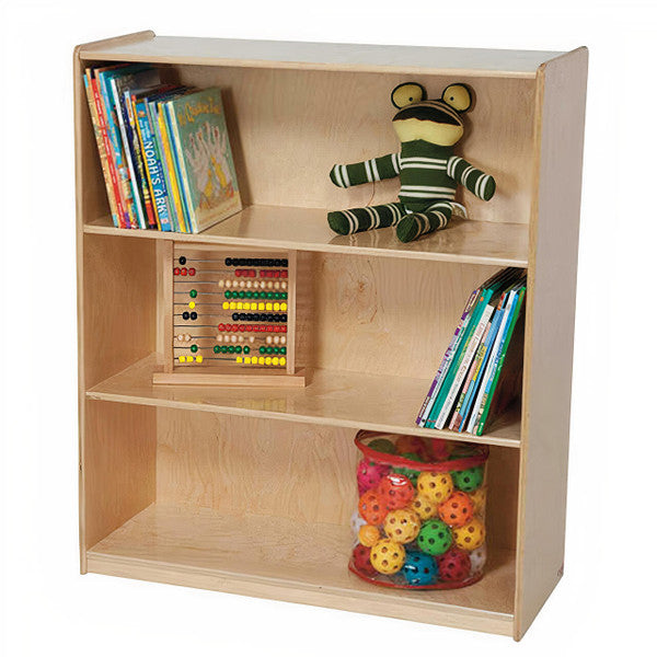 GREENGUARD Gold certified. Attractive bookshelf provides versatility in every room with (3) fixed shelves that have plenty of space for books, puzzles & more. Constructed from Birch Plywood, and coated with our exclusive Tuff-Gloss™ UV finish. A recessed back for added strength, stability, and beauty. Fully rounded corners and edges for maximum safety. 42-7/16"H x 36"W x 15"D. Fully assembled. Lifetime warranty. Made in the U.S.A.