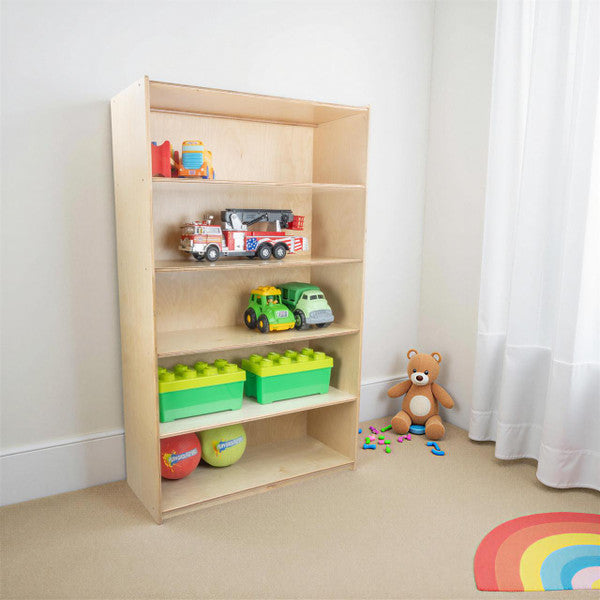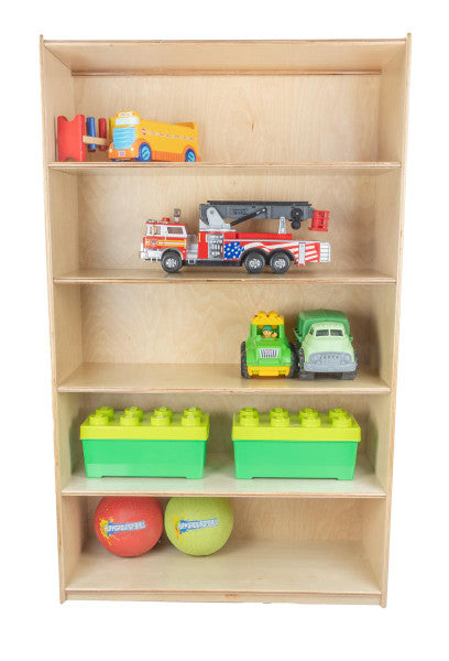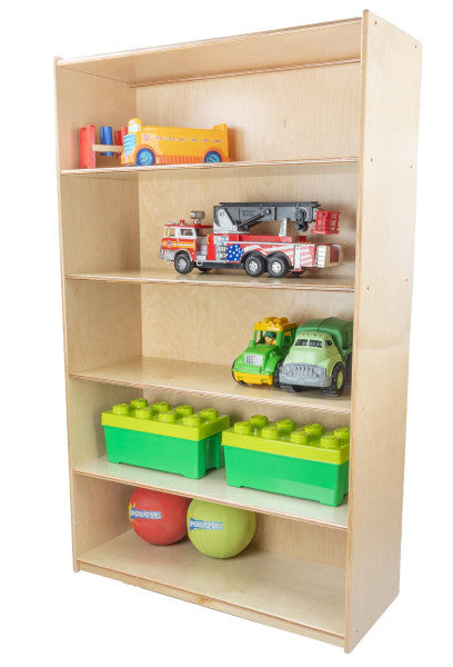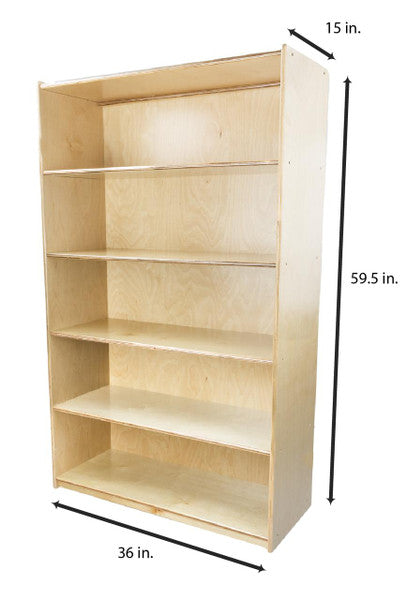 GREENGUARD Gold certified. Attractive bookshelf provides versatility in every room with (5) fixed shelves that have plenty of space for books, puzzles & more. Constructed from Birch Plywood, and coated with our exclusive Tuff-Gloss™ UV finish. A recessed back for added strength, stability, and beauty. Fully rounded corners and edges for maximum safety. 59-1/2"H x 36"W x 15"D. Fully assembled. Lifetime warranty. Made in the U.S.A.