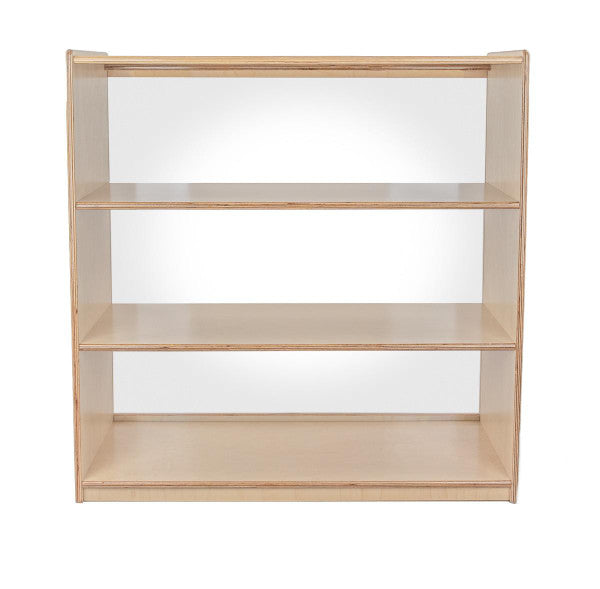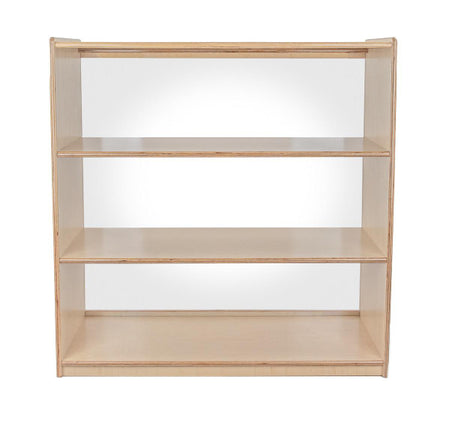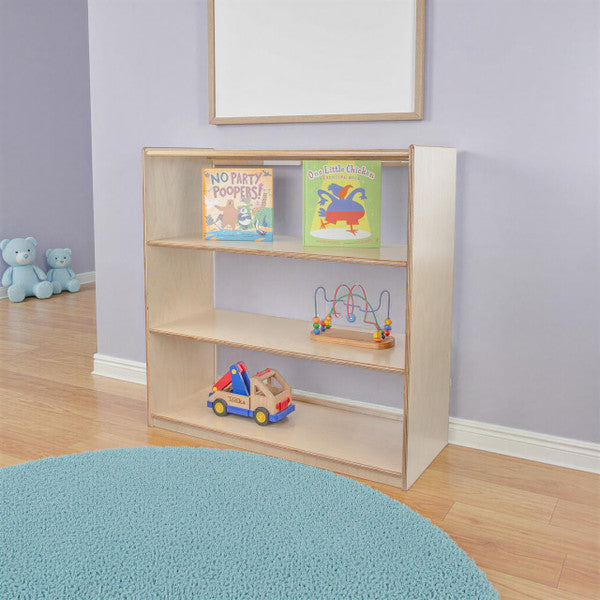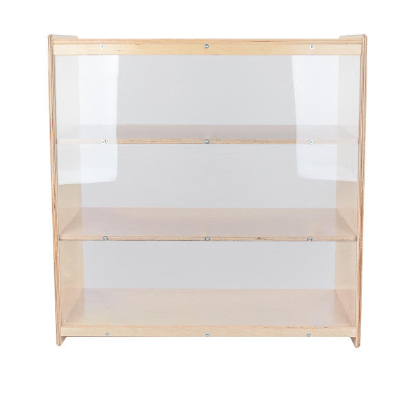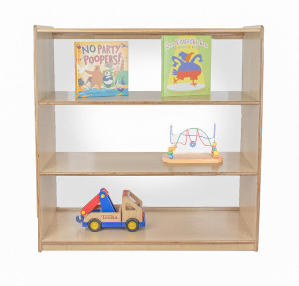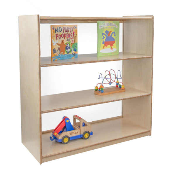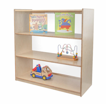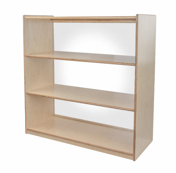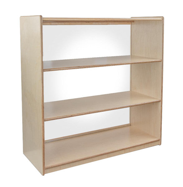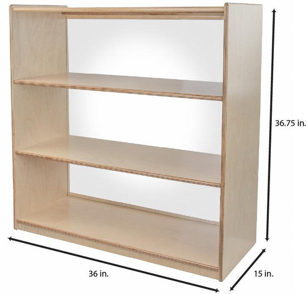 GREENGUARD Gold certified. Our acrylic back units keep the classroom open and visually stimulating to encourage children's natural development. This attractive bookshelf provides versatility in every room with (3) fixed shelves providing plenty of space for books, puzzles & more. Constructed from Birch Plywood, and coated with our exclusive Tuff-Gloss™ UV finish. A recessed back for added strength, stability, and beauty. Fully rounded corners and edges for maximum safety. 36-3/4"H x 36"W x 15"D. Fully assembled. Lifetime warranty. Made in the U.S.A.