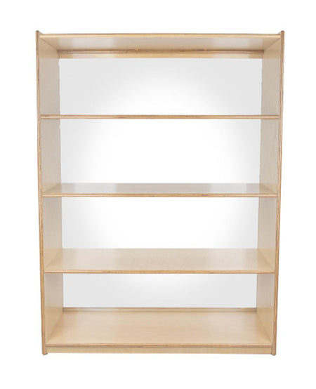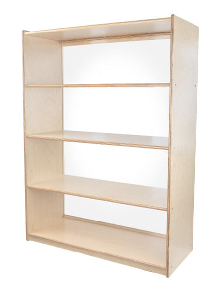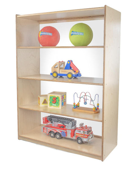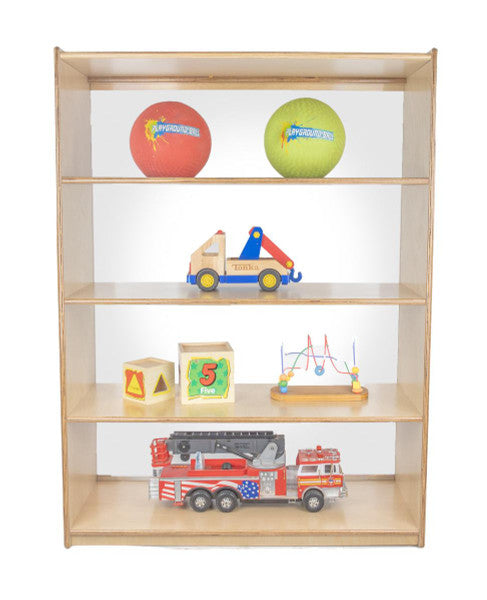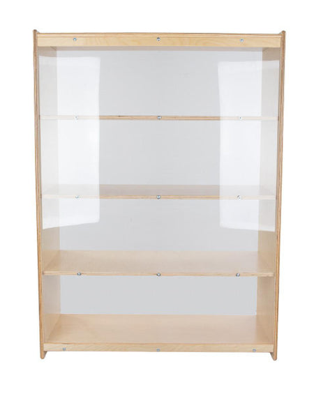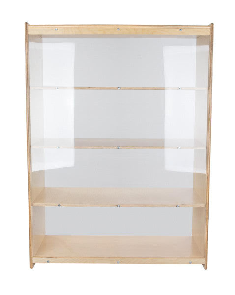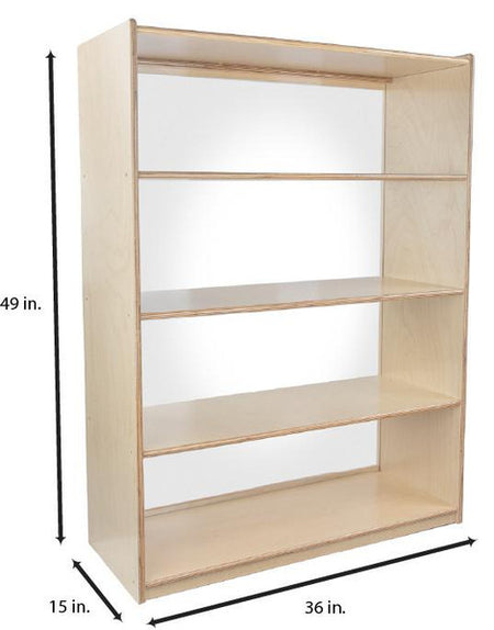 GREENGUARD Gold certified. Our acrylic back units keep the classroom open and visually stimulating to encourage children's natural development. This attractive bookshelf provides versatility in every room with (4) fixed shelves providing plenty of space for books, puzzles & more. Constructed from Birch Plywood, and coated with our exclusive Tuff-Gloss™ UV finish. A recessed back for added strength, stability, and beauty. Fully rounded corners and edges for maximum safety. 49"H x 36"W x 15"D. Fully assembled. Lifetime warranty. Made in the U.S.A.