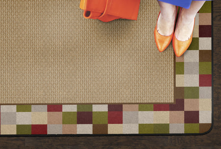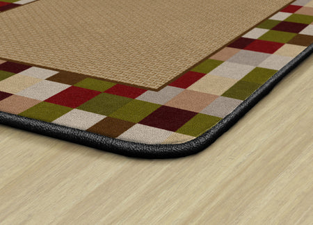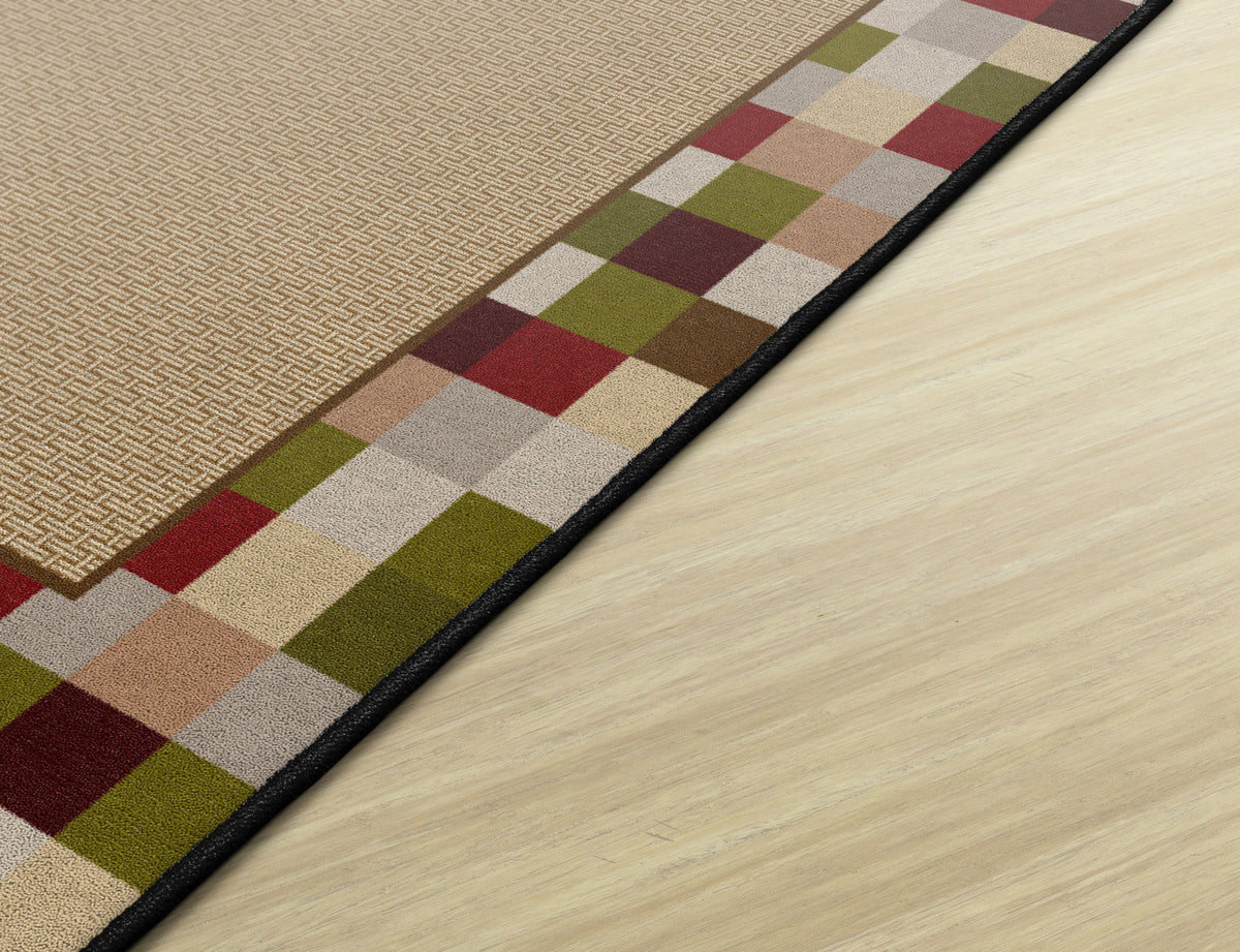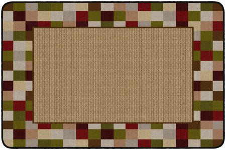 A modern design with a multi-colored block border surrounding a casual weave pattern
