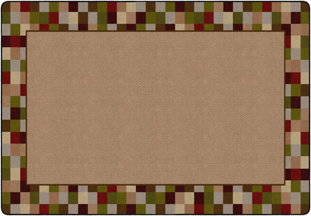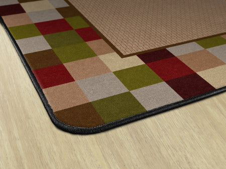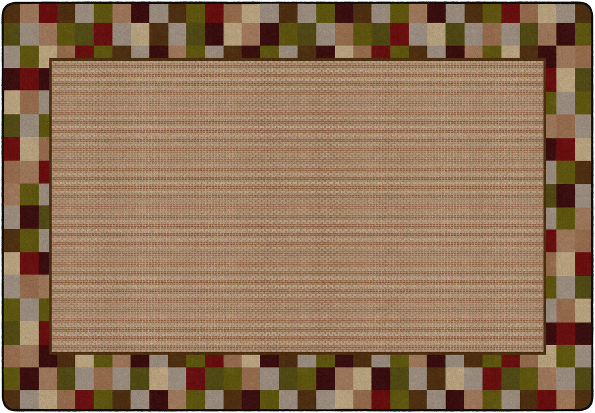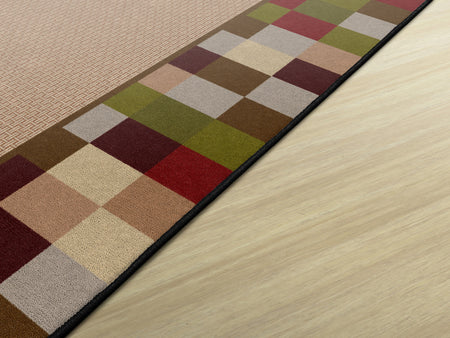 A modern design with a multi-colored block border surrounding a casual weave pattern