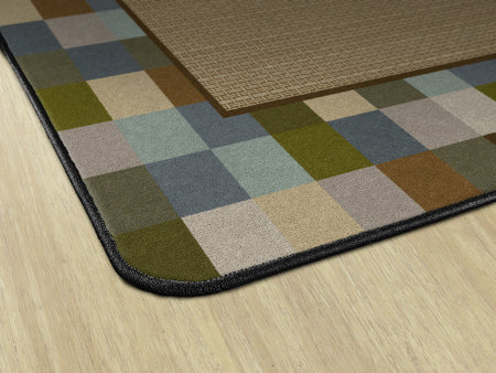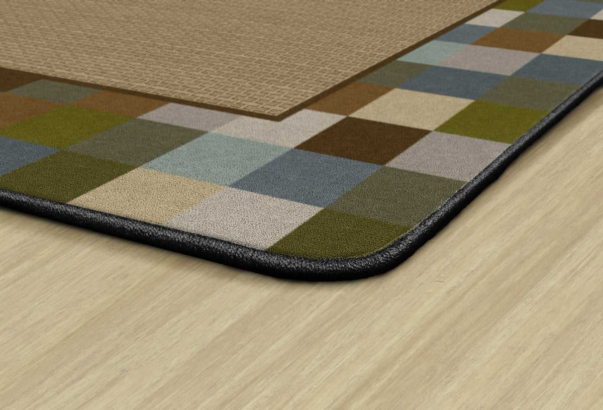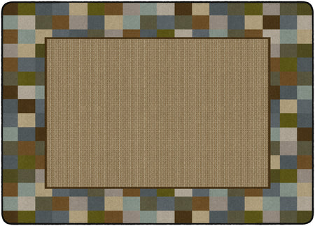 A modern design with a multi-colored block border surrounding a casual weave pattern