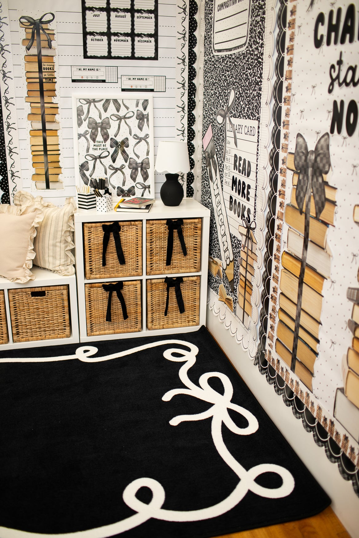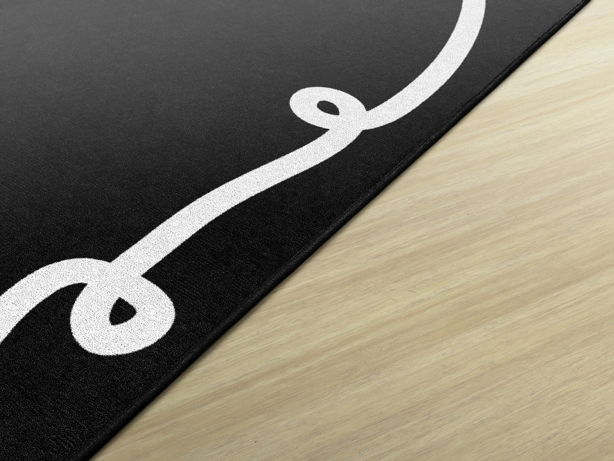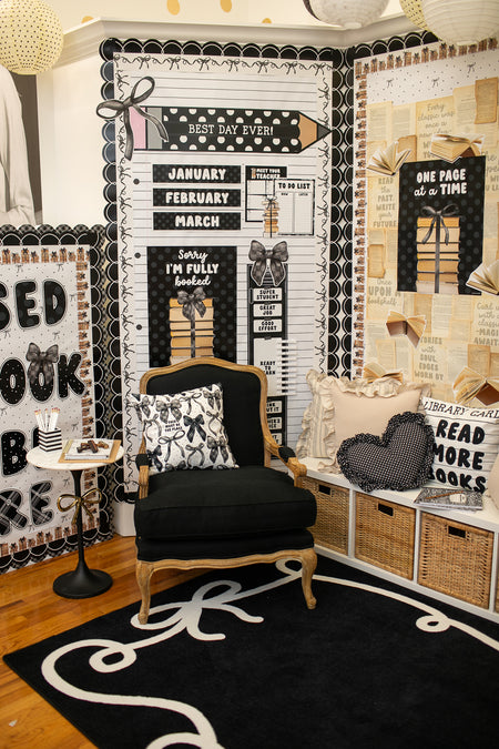 Add beauty and function to your classroom with the Bow Border Black Classroom Rug. Featuring classic black background with elegant white bow border, this rug is perfect for neutral, modern, or minimalist classroom themes. With soft, durable construction for daily classroom use, its the perfect foundation for learning spaces.