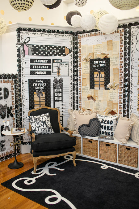 Add beauty and function to your classroom with the Bow Border Black Classroom Rug. Featuring classic black background with elegant white bow border, this rug is perfect for neutral, modern, or minimalist classroom themes. With soft, durable construction for daily classroom use, its the perfect foundation for learning spaces.