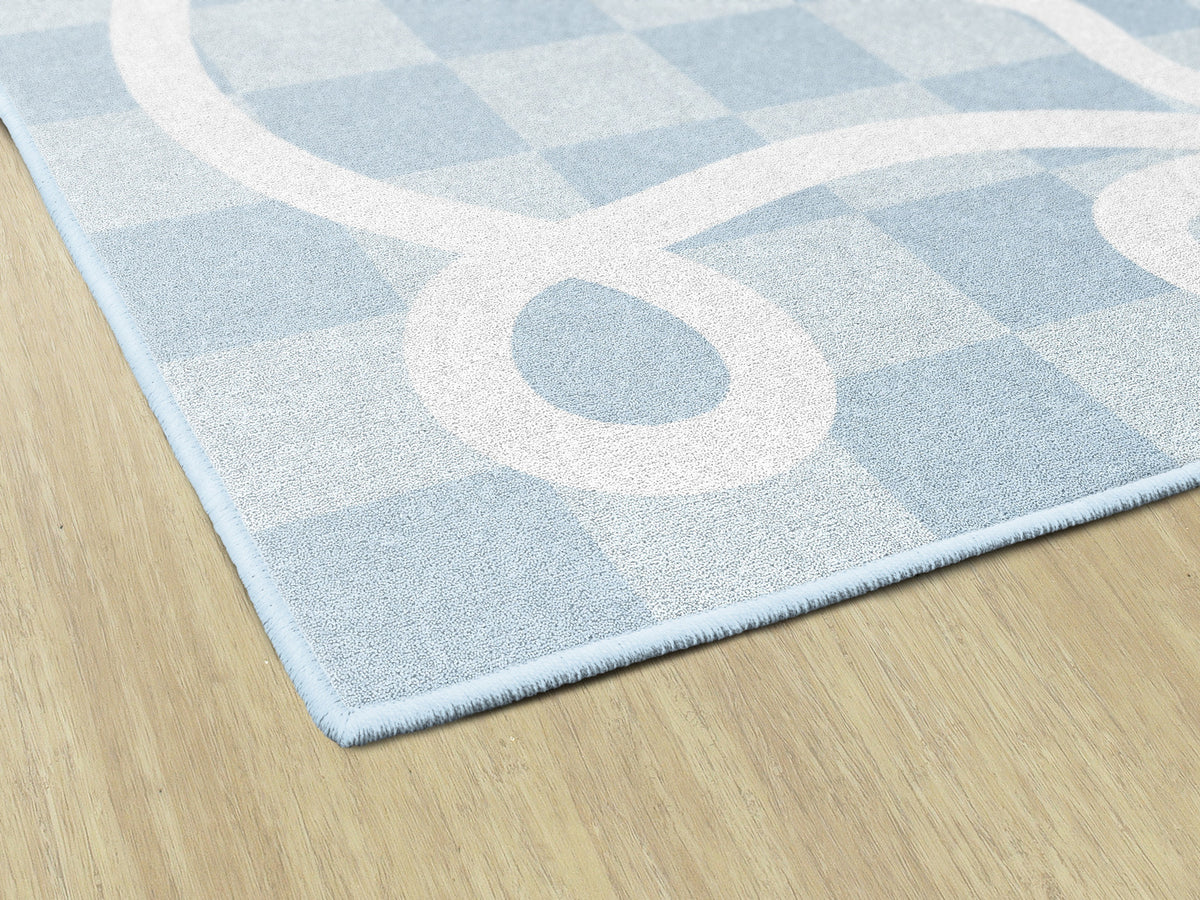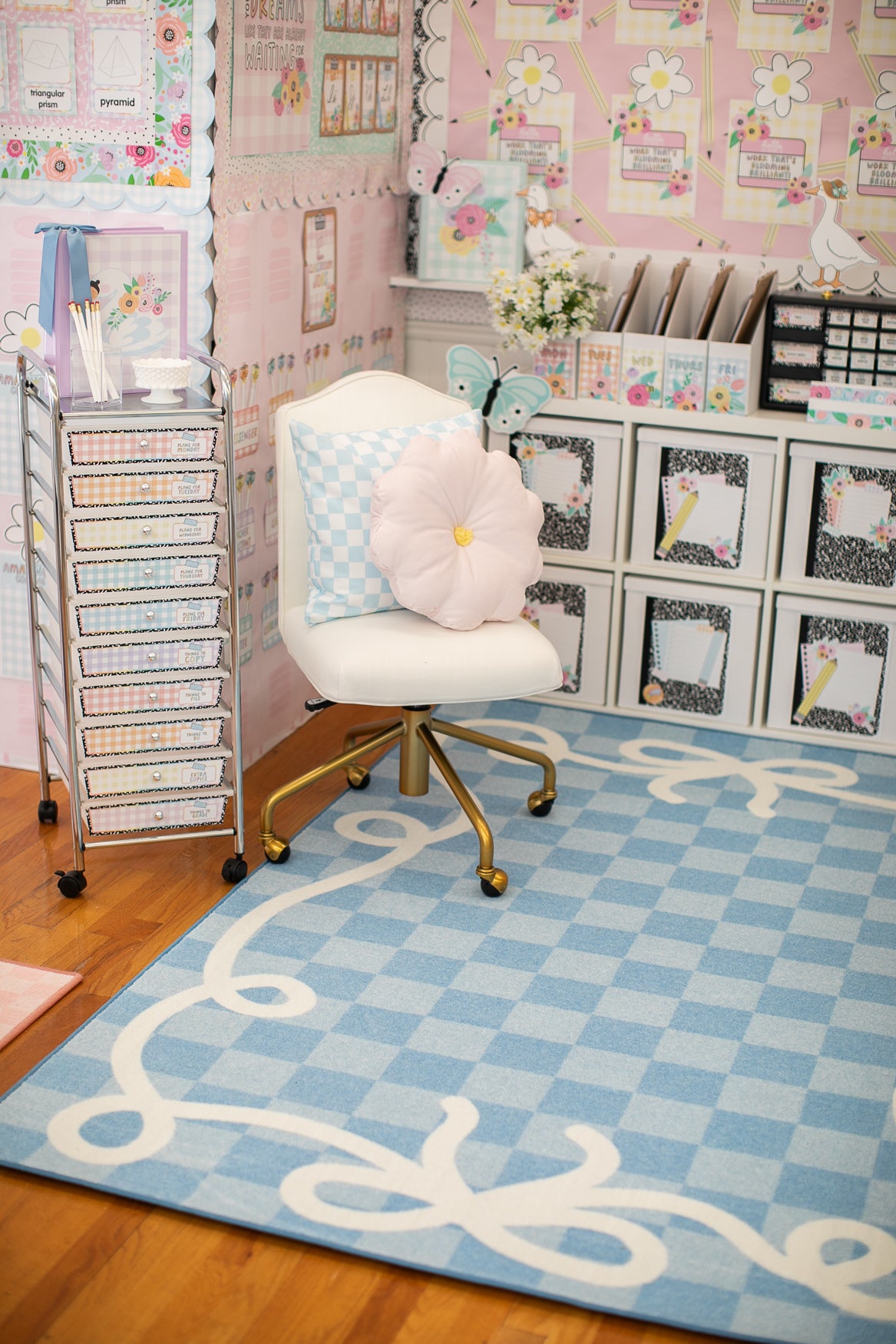 Add beauty and function to your classroom with the Bow Border Blue Check Rug. Featuring sky blue check pattern with a signature bow frame, this rug is adds a soft, cozy aesthetic to any classroom. With durable for busy classroom environments, it’s the perfect foundation for learning spaces. Pairs beautifully with blue-themed decor sets