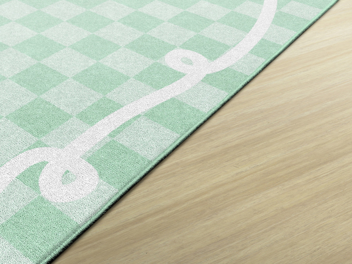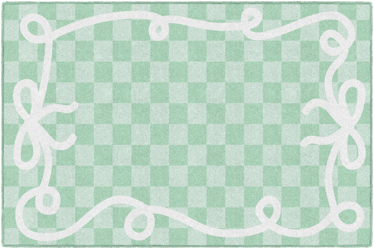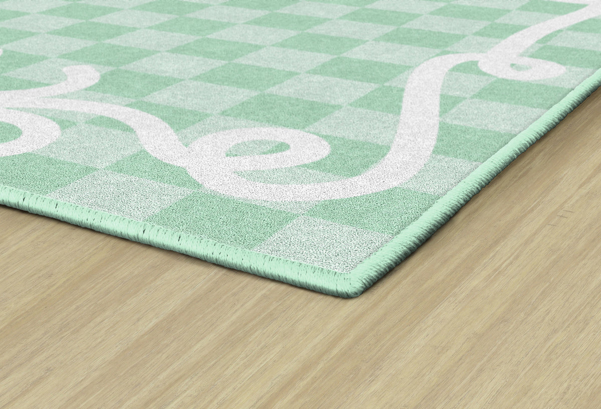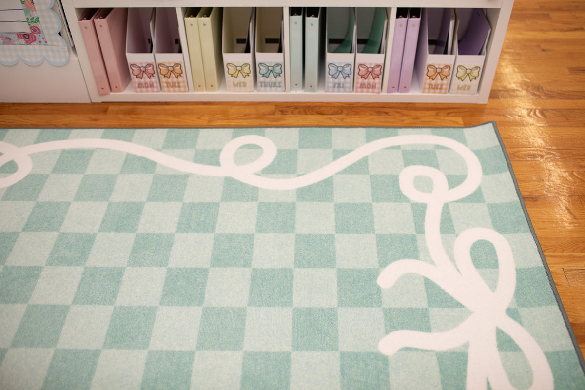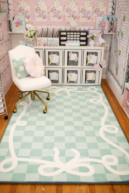 Add beauty and function to your classroom with the Bow Border Mint Check Rug. Featuring soft mint green check pattern with signature bow border, this rug is creates a calming and fresh classroom vibe. With designed to withstand daily student use, its the perfect foundation for learning spaces.
