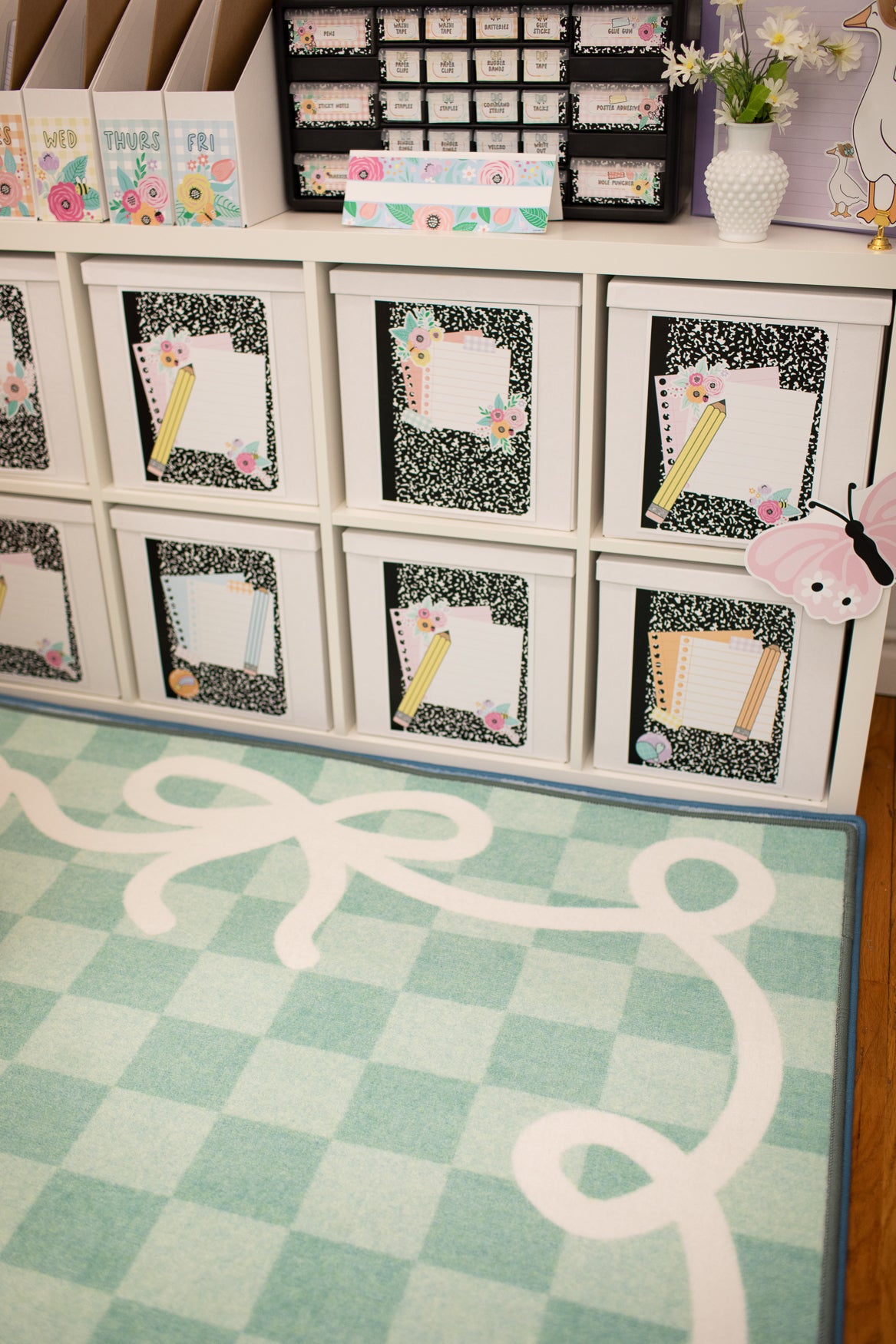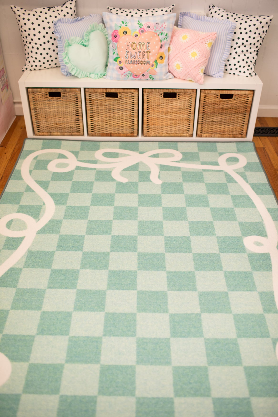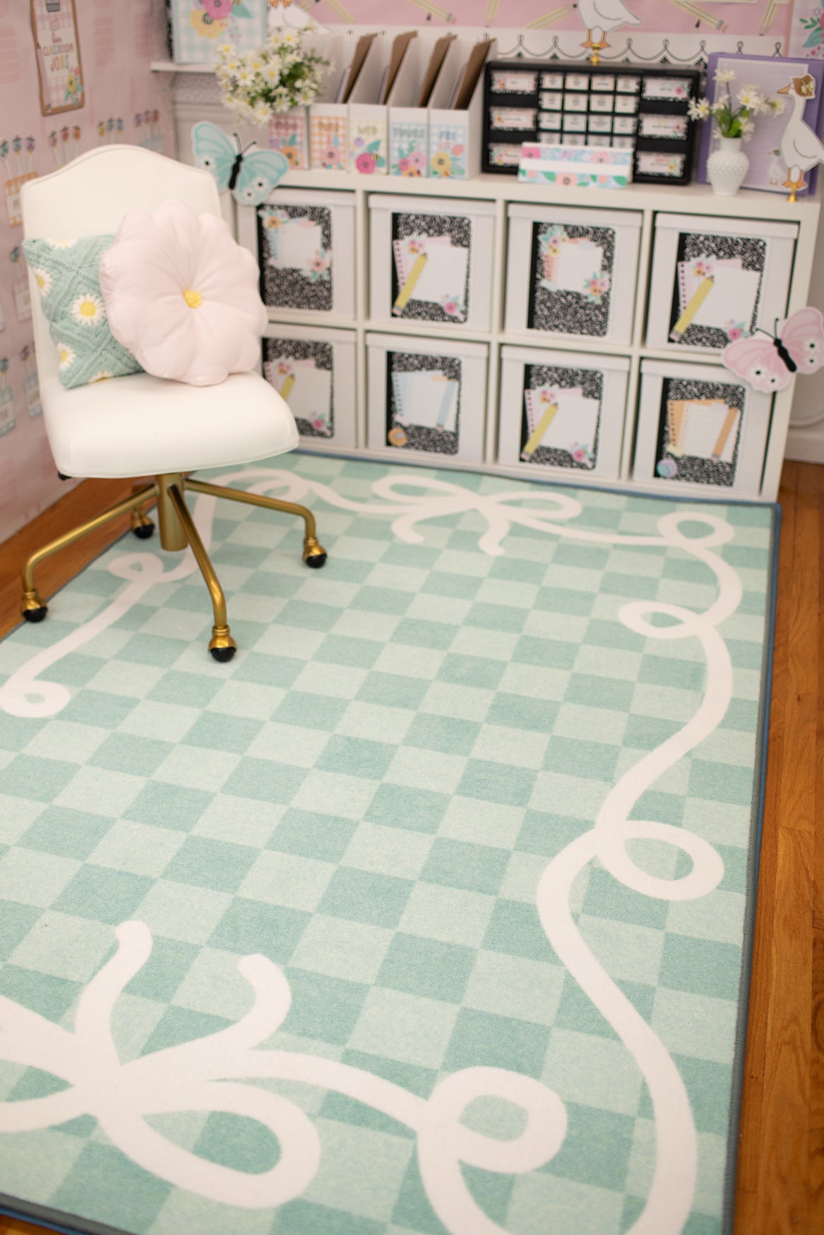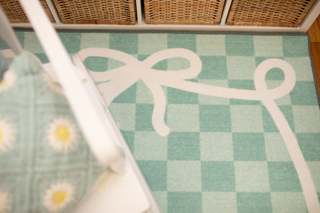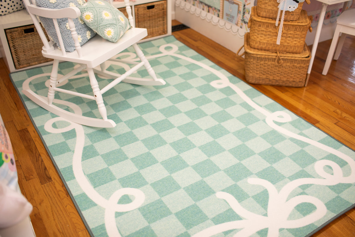 Add beauty and function to your classroom with the Bow Border Mint Check Rug. Featuring soft mint green check pattern with signature bow border, this rug is creates a calming and fresh classroom vibe. With designed to withstand daily student use, its the perfect foundation for learning spaces.