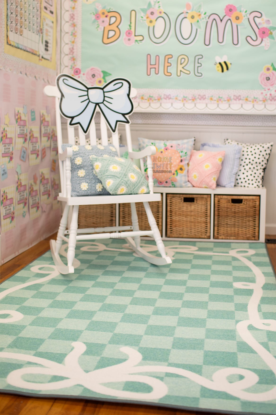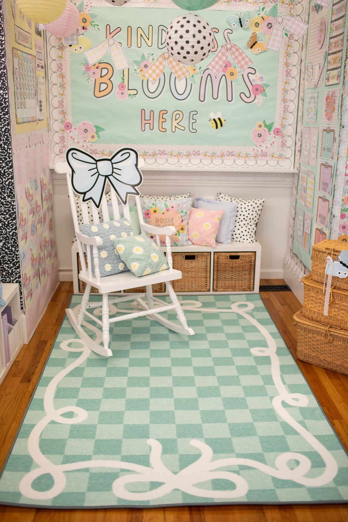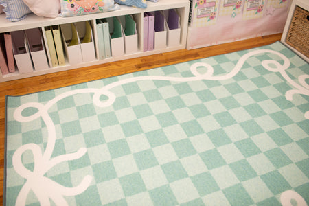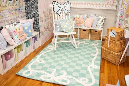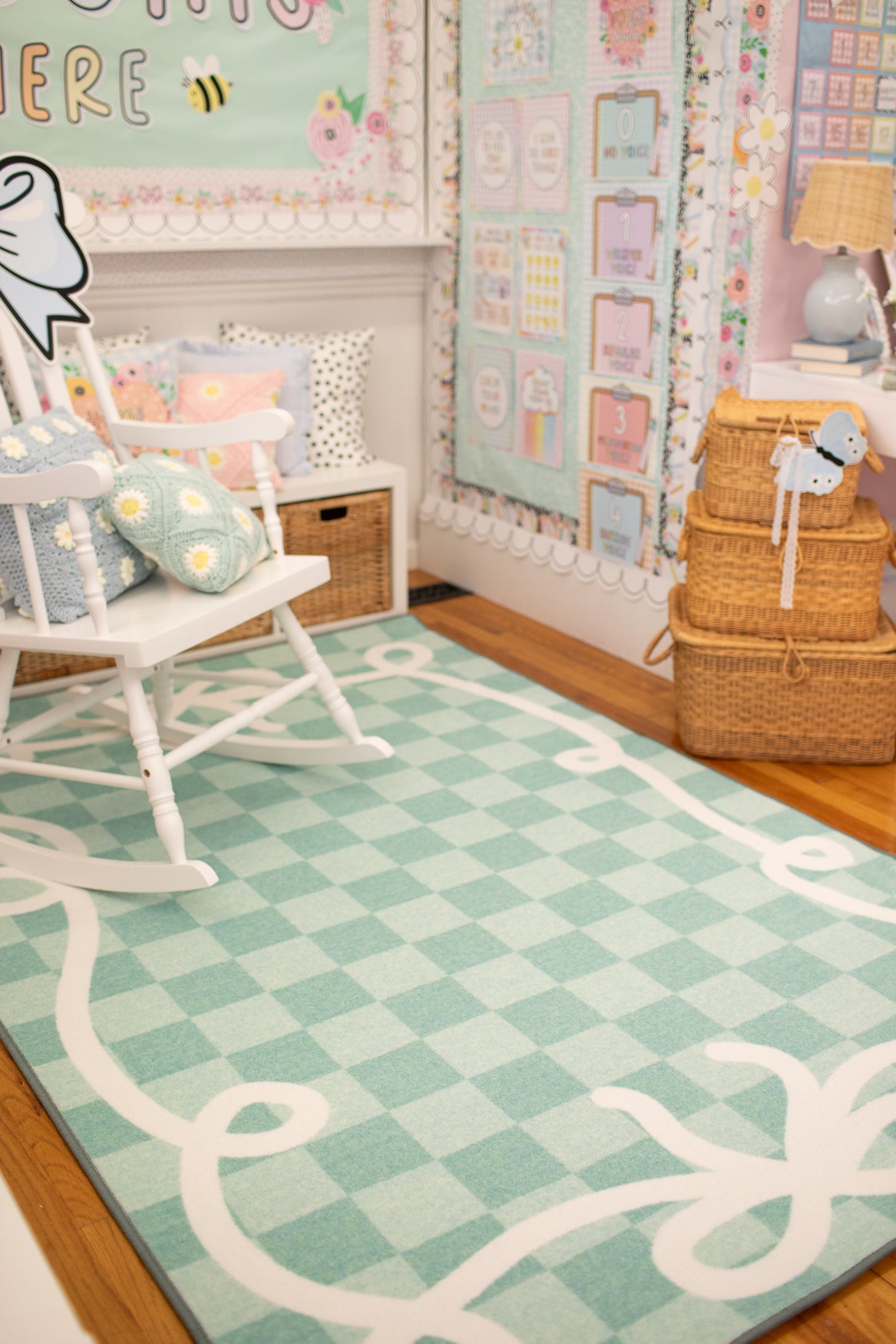 Add beauty and function to your classroom with the Bow Border Mint Check Rug. Featuring soft mint green check pattern with signature bow border, this rug is creates a calming and fresh classroom vibe. With designed to withstand daily student use, its the perfect foundation for learning spaces.