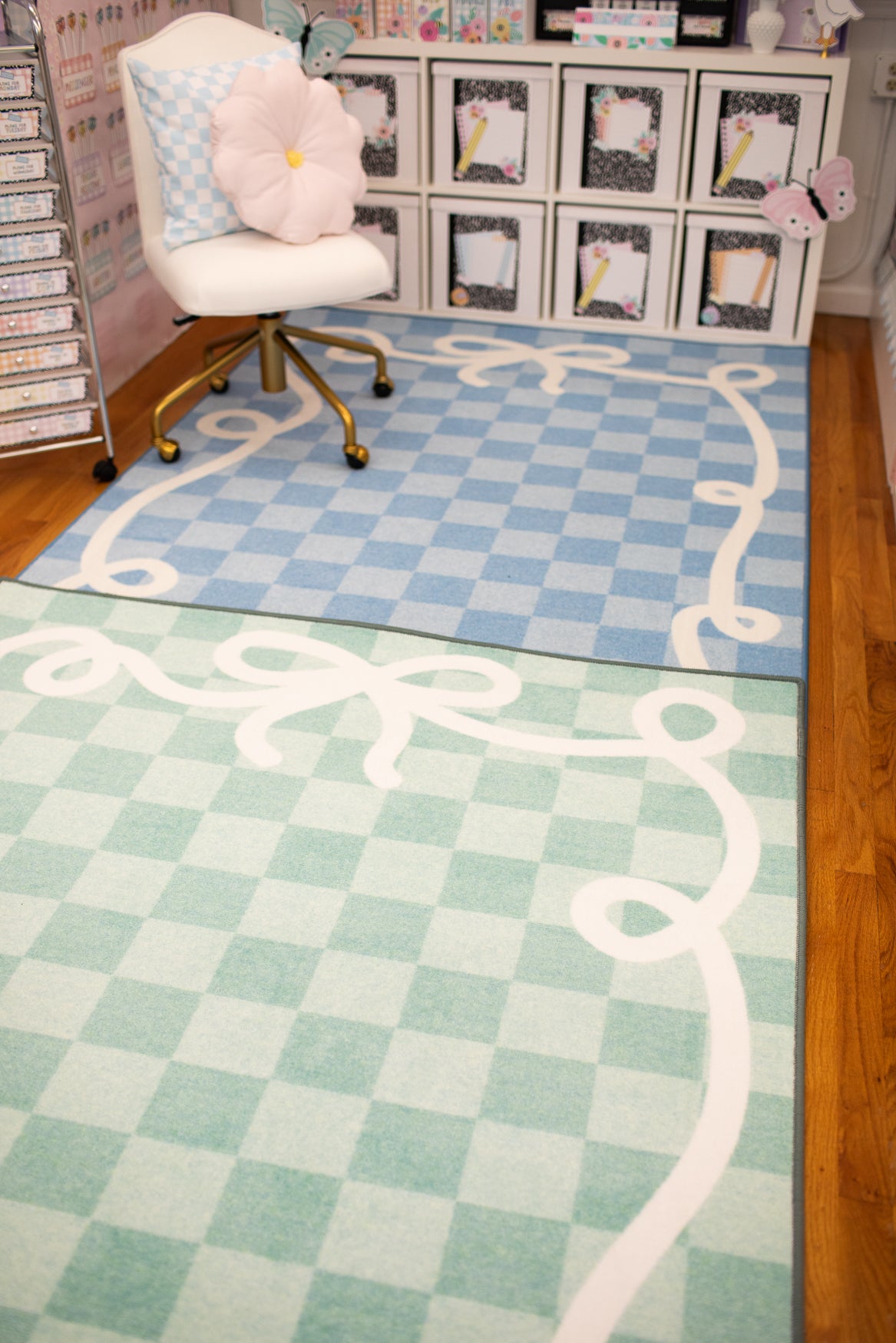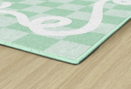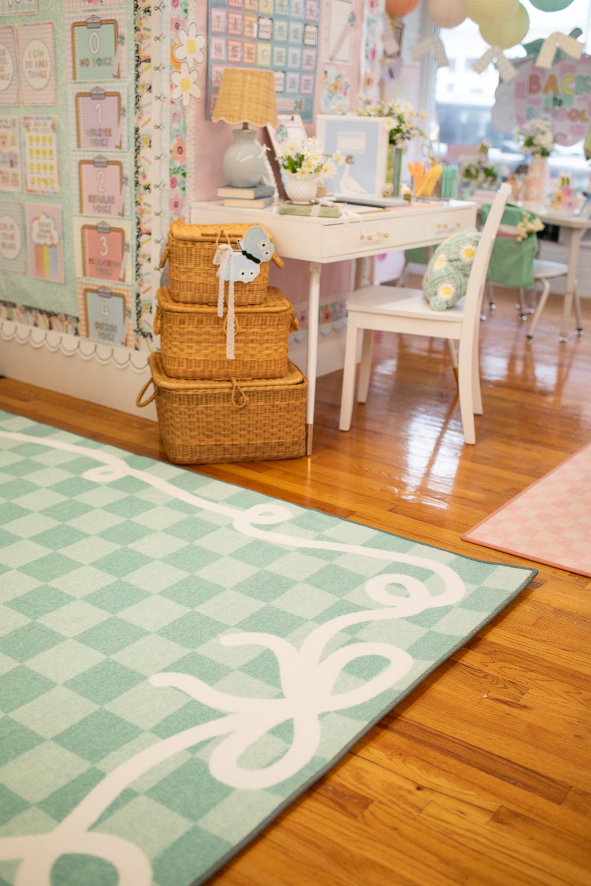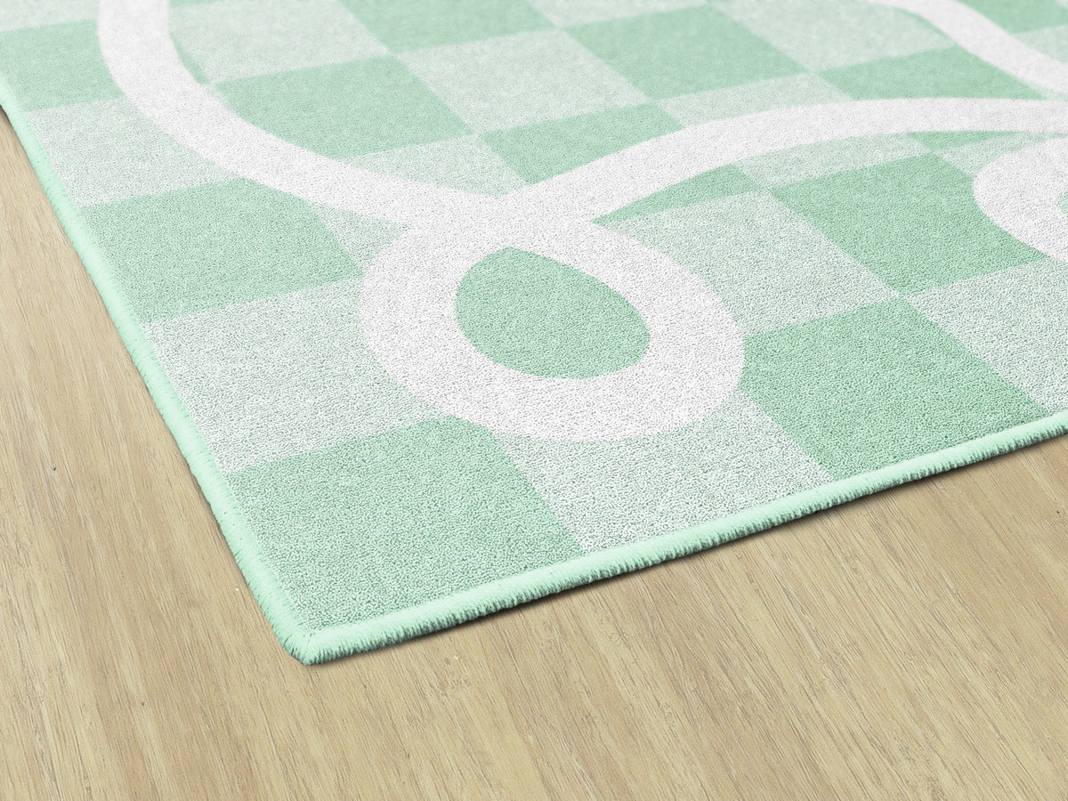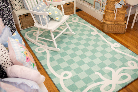 Add beauty and function to your classroom with the Bow Border Mint Check Rug. Featuring soft mint green check pattern with signature bow border, this rug is creates a calming and fresh classroom vibe. With designed to withstand daily student use, its the perfect foundation for learning spaces.