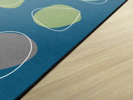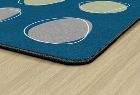 Provide easy structure for your students with the Calm Spots rug! This rug features a playful grid of pebble-like shapes in soft greens, teals, and greys, each outlined with a light, hand-drawn loop. Set against a deep blue background, the shapes create a calm, modern look that adds both color and comfort to any learning space.
