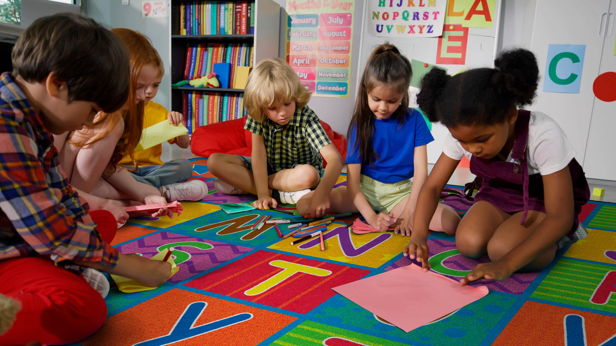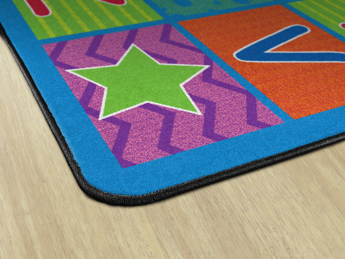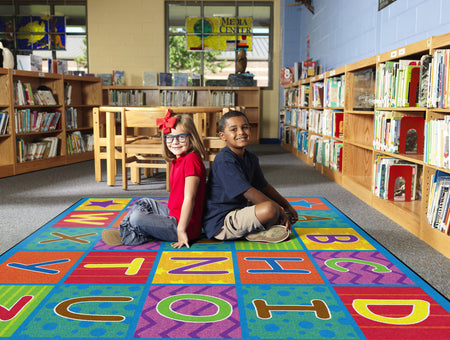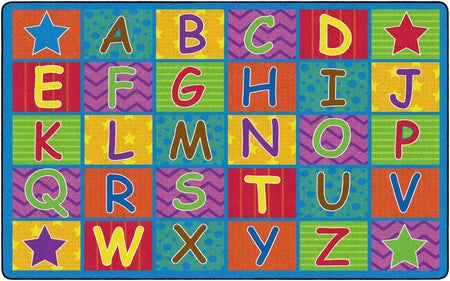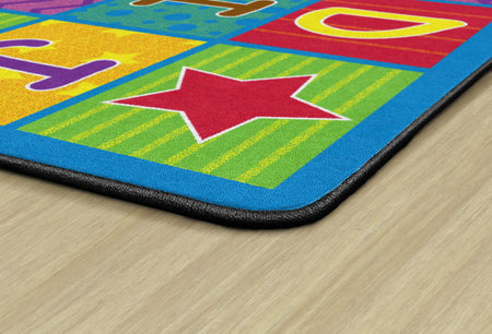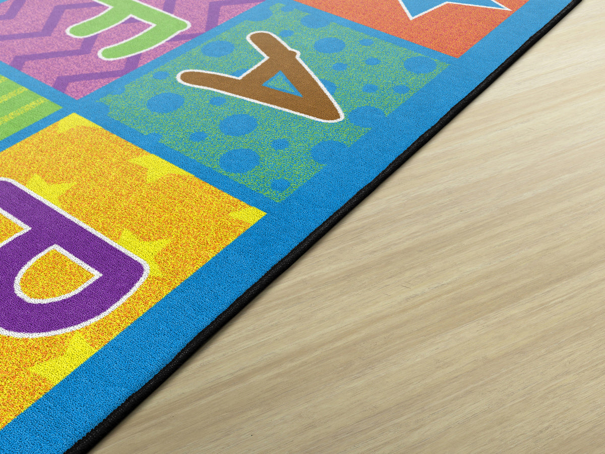 Cheerful Alphabet School Rug shows off the ABC's in bright happy colors and fun patterns. Reinforce your students' alphabet learning while providing the class organized seating. Add a little happy to your classroom.