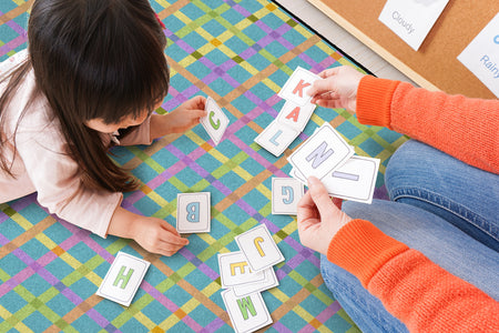Fun and versatile, this area rug will bring a bold pop of color to any classroom, daycare, playroom, or child's bedroom. In vivid shades of robin's egg blue, spring green, cheerful yellow, and pretty purple and pink, this carpet will create a warm and welcoming environment in any space.