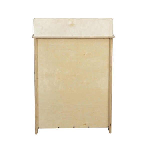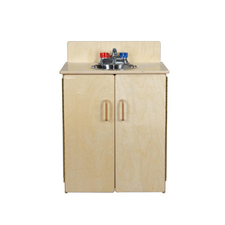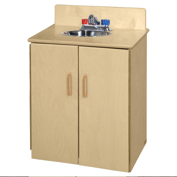 GREENGUARD Gold certified. This sink combines an innovative new realistic silver faucet with movable plastic knobs, smooth plastic door handles, and a durable plastic sink pan. Constructed from Birch Plywood, and coated with our exclusive Tuff-Gloss™ UV finish. A recessed back for added strength, stability, and beauty. Full length Pinch-Me-Not™™ hinges with full length Tip-Me-Not™ doors. Fully rounded corners, edges, and doors for maximum safety. 22-9/16"H x 20-1/2"W x 15"D. Fully assembled. Lifetime warranty. Made in the U.S.A.