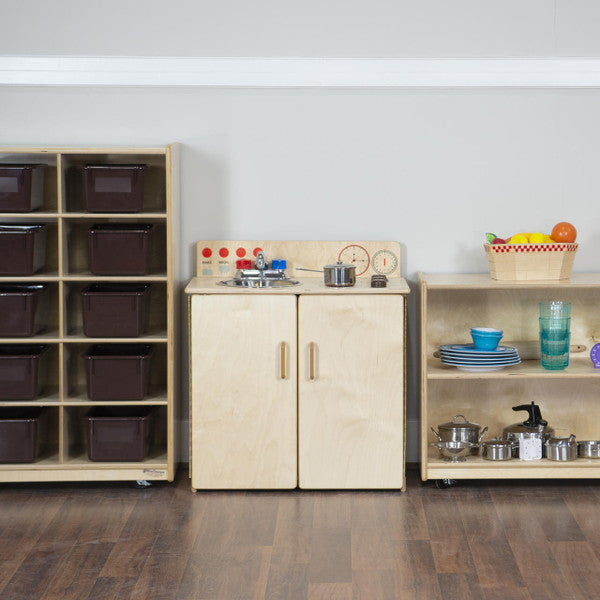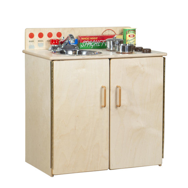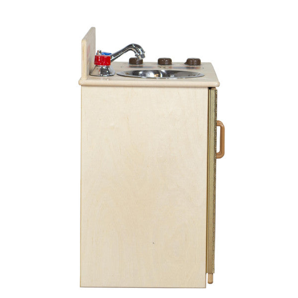 GREENGUARD Gold certified. Two-burner range & sink combo in one compact space-saving design. Constructed from Birch Plywood, and coated with our exclusive Tuff-Gloss™ UV finish. A recessed back for added strength, stability, and beauty. Full length Pinch-Me-Not™™ hinges with full length Tip-Me-Not™ doors. Fully rounded corners, edges, and doors for maximum safety. 22-9/16"H x 24-1/2"W x 15"D. Fully assembled. Lifetime Warranty. Made in the U.S.A.
