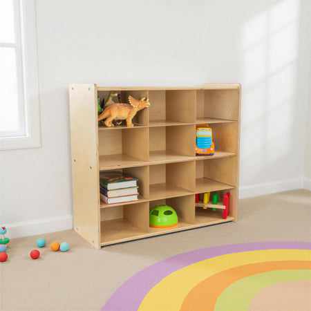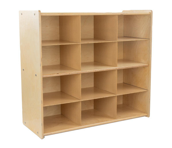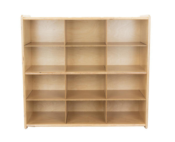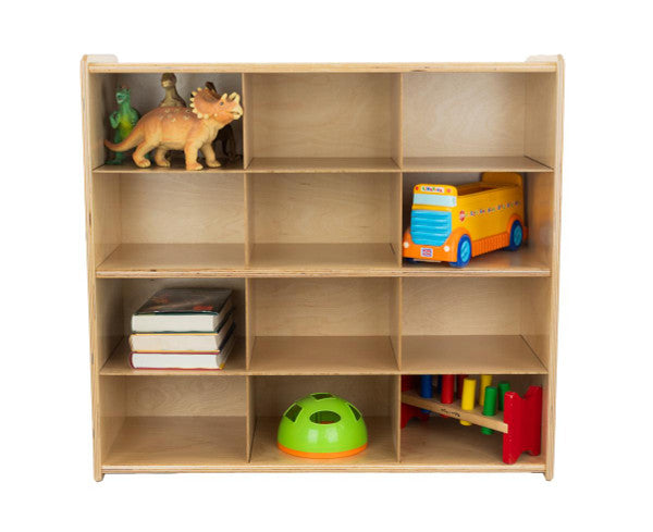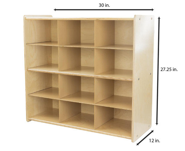 GREENGUARD Gold certified. Room for (12) cubby trays to provide storage organization for small toys, knick-knacks, or supplies that may otherwise be misplaced. Birch Plywood, with mortise & secure fastener construction for exceptional strength and durability. Our exclusive UV Finish provides unsurpassed protection. Fully rounded corners and edges for maximum safety. 27-1/4"H x 30"W x 12"D. Ready to assemble. Lifetime warranty. Made in the U.S.A.