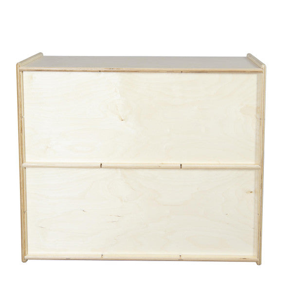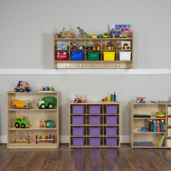 GREENGUARD Gold certified. (12) purple pastel cubby trays provide storage organization for small toys, knick-knacks, or supplies that may otherwise be misplaced. Birch Plywood, with mortise & secure fastener construction for exceptional strength and durability. Our exclusive UV Finish provides unsurpassed protection. Fully rounded corners and edges for maximum safety. 27-1/4"H x 30"W x 12"D. Ready to assemble. Lifetime warranty. Made in the U.S.A.