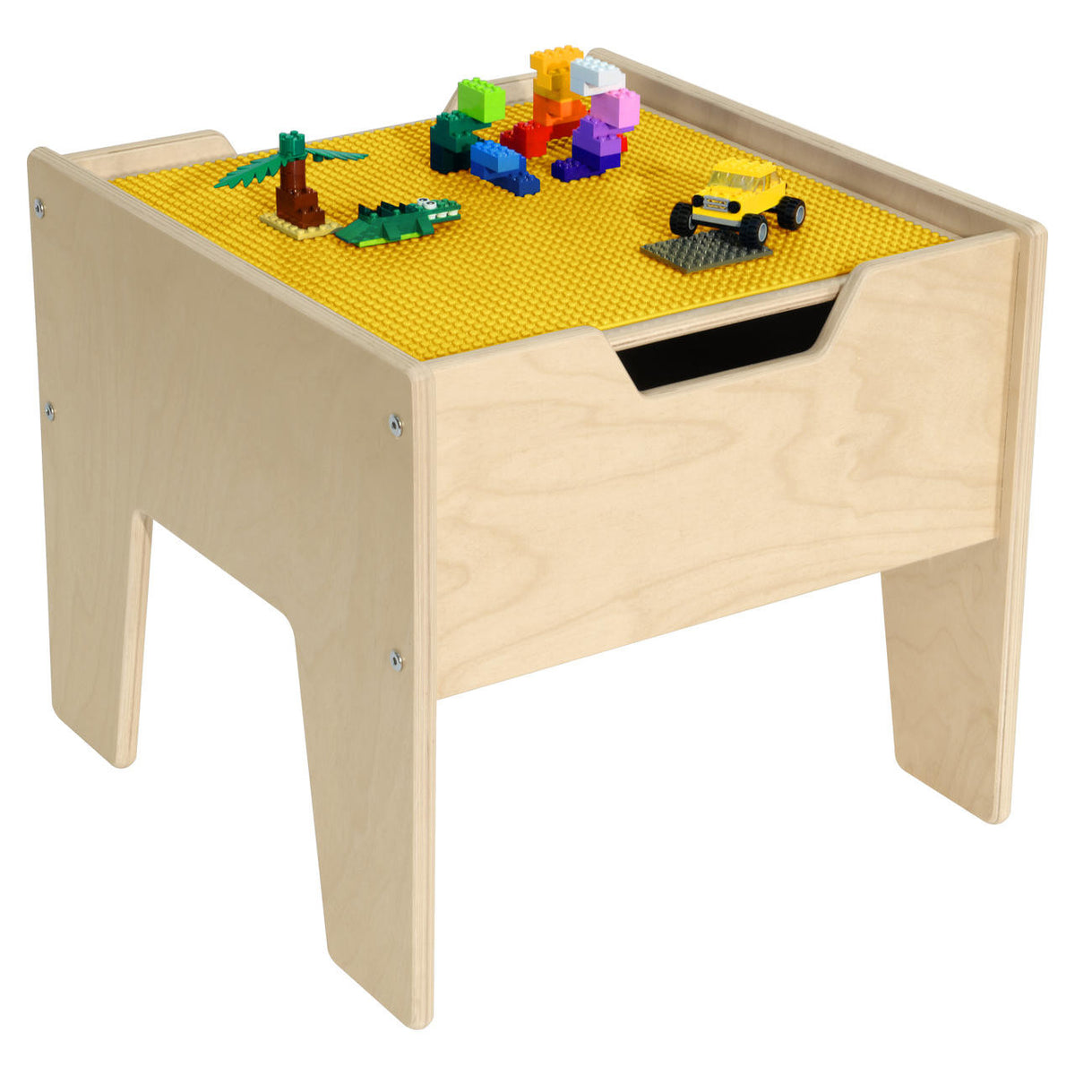 GREENGUARD Gold certified. This LEGO® compatible table is perfect for any child with a big imagination. A yellow LEGO® compatible top on one side and a race car track graphic on the reverse side make this a versatile table. The extra deep well allows for toy and block storage keeping all manipulatives organized. Birch Plywood, with mortise & secure fastener construction for exceptional strength and durability. Our exclusive UV Finish provides unsurpassed protection. Fully rounded corners and edges for maximum safety. 16"H x 18-5/8"W x 17-5/8"D. Ready to assemble. Lifetime warranty. Made in the U.S.A. LEGO® is a trademark of the LEGO Group of companies which does not sponsor, authorize, or endorse this product.