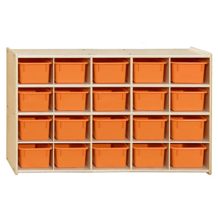 GREENGUARD Gold certified. (20) orange pastel cubby trays provide storage organization for small toys, knick-knacks, or supplies that may otherwise be misplaced. Birch Plywood, with mortise & secure fastener construction for exceptional strength and durability. Our exclusive UV Finish provides unsurpassed protection. Fully rounded corners and edges for maximum safety. 27-1/4"H x 46-3/4"W x 12"D. Ready to assemble with casters available separately. Lifetime warranty. Made in the U.S.A.