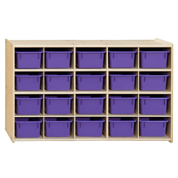 GREENGUARD Gold certified. (20) purple pastel cubby trays provide storage organization for small toys, knick-knacks, or supplies that may otherwise be misplaced. Birch Plywood, with mortise & secure fastener construction for exceptional strength and durability. Our exclusive UV Finish provides unsurpassed protection. Fully rounded corners and edges for maximum safety. 27-1/4"H x 46-3/4"W x 12"D. Fully assembled with casters available separately. Lifetime warranty. Made in the U.S.A.