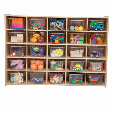 GREENGUARD Gold certified. (25) translucent cubby trays provide storage organization for small toys, knick-knacks, or supplies that may otherwise be misplaced. Birch Plywood, with mortise & secure fastener construction for exceptional strength and durability. Our exclusive UV Finish provides unsurpassed protection. Fully rounded corners and edges for maximum safety. 33-7/8"H x 46-3/4"W x 12"D. Fully assembled with casters available separately. Lifetime warranty. Made in the U.S.A.