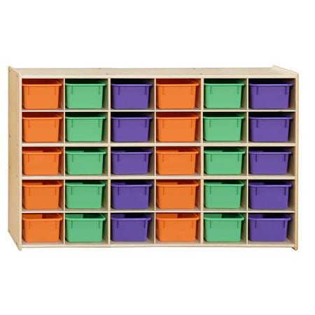 GREENGUARD Gold certified. (30) asorted pastel cubby trays provide storage organization for small toys, knick-knacks, or supplies that may otherwise be misplaced. Birch Plywood, with mortise & secure fastener construction for exceptional strength and durability. Our exclusive UV Finish provides unsurpassed protection. Fully rounded corners and edges for maximum safety. 33-7/8"H x 50-3/4"W x 12"D. Fully assembled with casters available separately. Lifetime warranty. Made in the U.S.A.